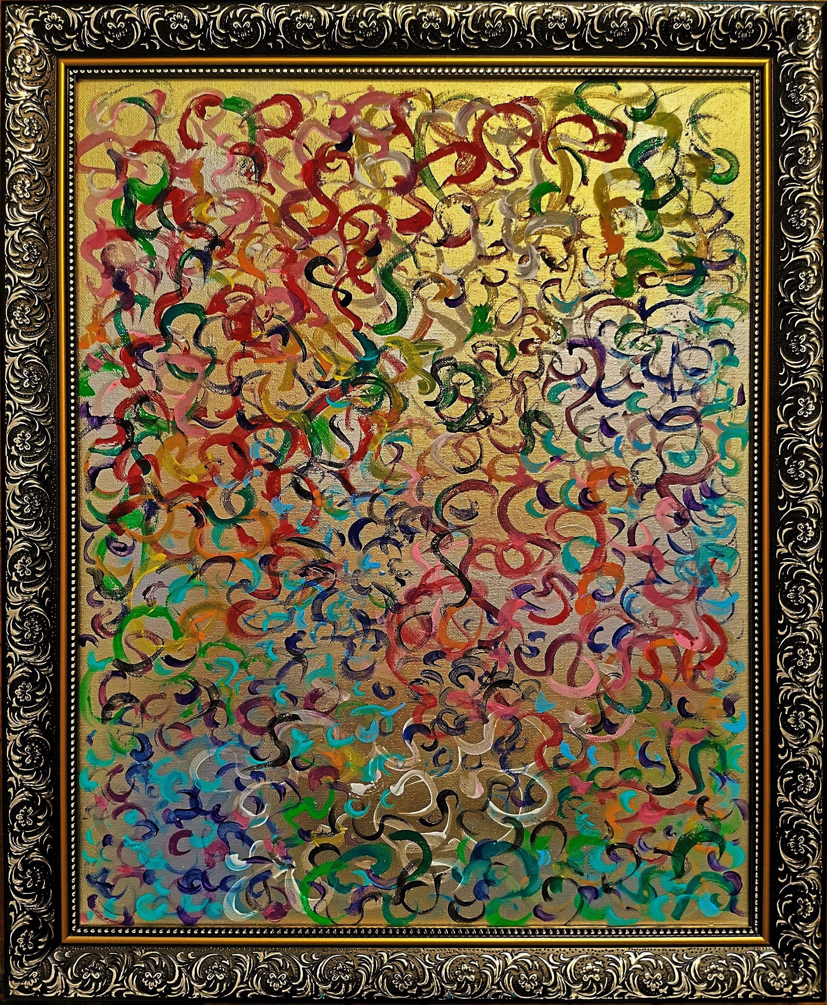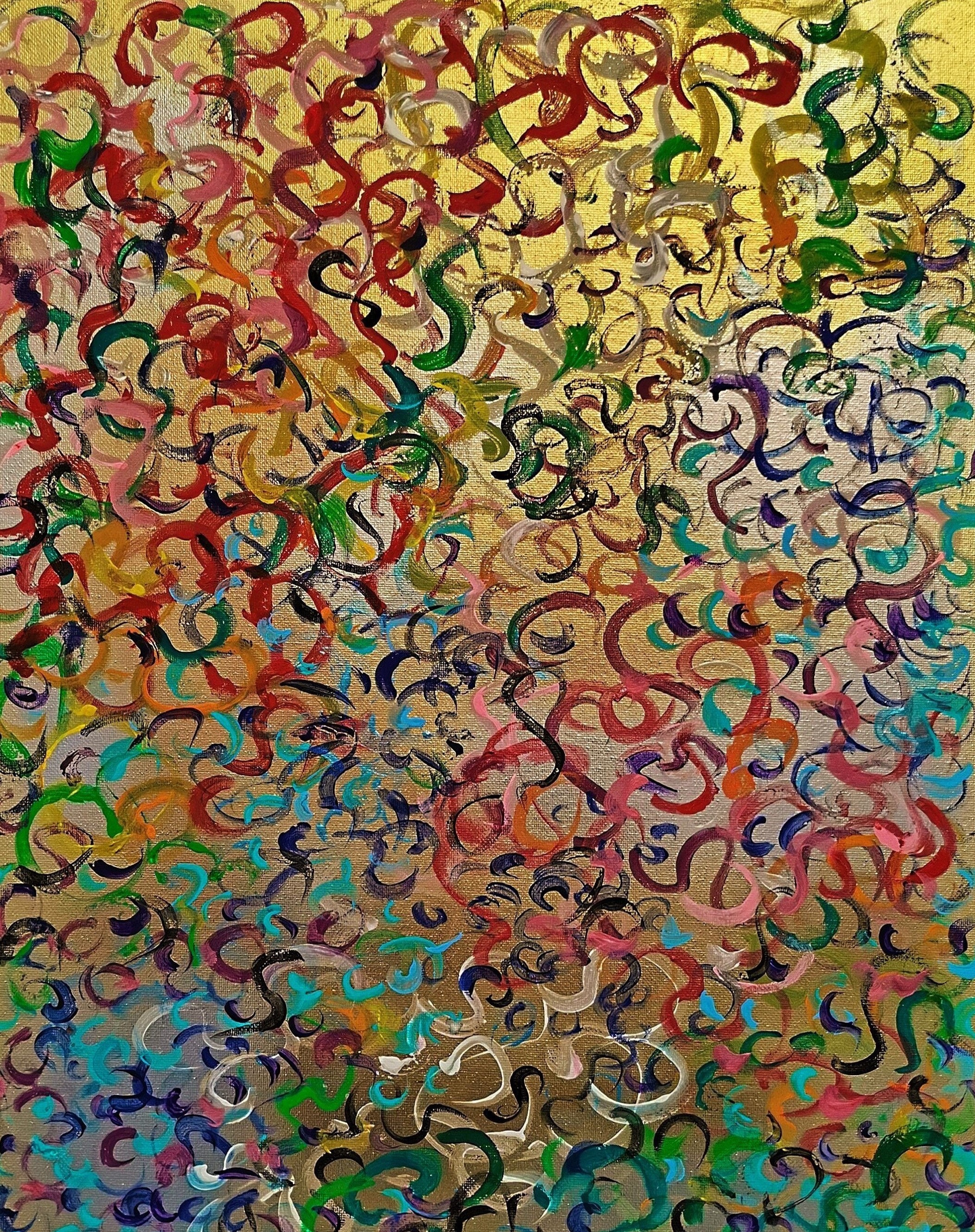 Ten obraz to prawdziwa eksplozja kolorów i kształtów. Złote tło stanowi idealną scenę dla wirujących, abstrakcyjnych pętli w różnych odcieniach: srebro, czerwieni, zieleni, niebieskiego i fioletu. Kiedy patrzysz na tę kompozycję, czujesz jakbyś zanurzał się w dynamiczny taniec barw. Jest tu trochę chaosu, ale takiego przyjemnego dla oka, jakby każdy z tych zakrętów miał swoją własną historię do opowiedzenia. Obraz emanuje energią i żywiołowością. Czuć tu ruch, jakby każda kreska miała swoją osobistą melodię. Artysta eksperymentuje z techniką nakładania farby, tworząc głębię i trójwymiarowość dzięki grubszym i cieńszym pociągnięciom pędzla. Stylistycznie dzieło przypomina nowoczesną sztukę abstrakcyjną, niemalże op-art. Efekt jest trochę jak kalejdoskop, który zmienia się z każdym spojrzeniem. Patrząc na to, można poczuć zarówno spokój, jak i ekscytację - emocje mieszają się jak farby na palecie. Jedno rzeczą jest pewna: obraz podobnie jak zasada "don't overthink" w stylu amerykańskim, inspiruje do bardziej swobodnego podejścia do sztuki.