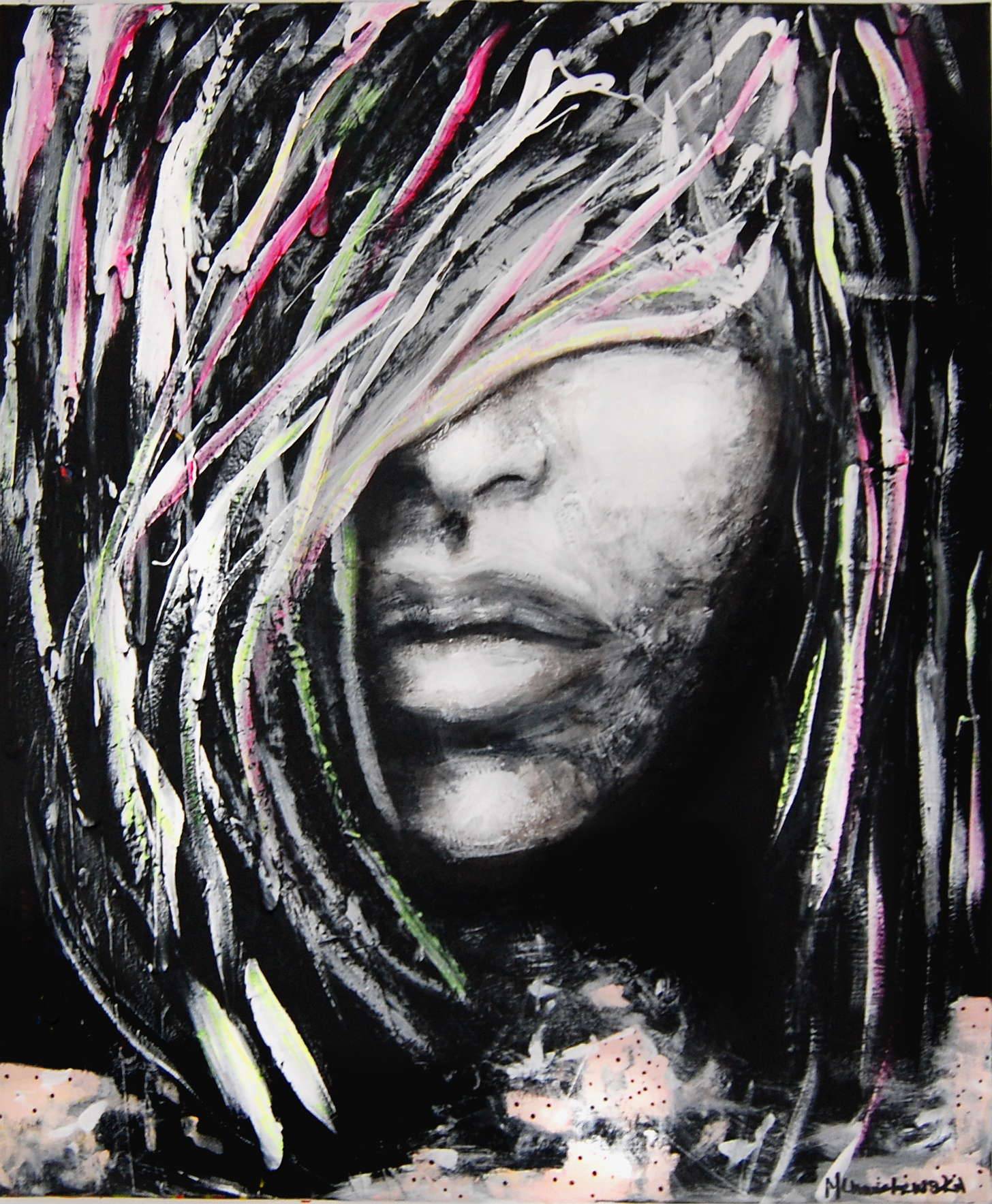 Łączący aurę tajemniczości i lekkości obraz olejno akrylowy namalowany na bawełnianym podobraziu. Tworzony w technice mieszanej przy użyciu pędzli, szpachli i aerografu. Praca nie wymaga oprawy, boki obrazu są zamalowane, gotowy do powieszenia. Praca zawerniksowana błyszczącym werniksem, dzięki czemu kolory są wysycone, a sam obraz nabiera głębi. Obraz jest sygnowany z tyłu i z przodu monogramem artysty/Milena Chmielewska. Obraz doskonale odnajdzie się zarówno w nowoczesnym jak i klasycznym wnętrzu. Stanowi idealny prezent dla wielbicieli nietuzinkowej sztuki.