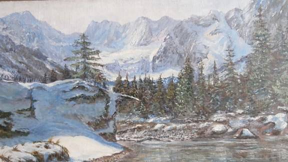Na obrazie dominuje zimowy krajobraz górski. Białe szczyty gór w tle kontrastują z ciemną zielenią sosen, które oplatają dolinę. Śnieg przykrywa zbocza gór, tworząc jakby puszysty dywan, a wartki strumień płynący przez środek kompozycji błyszczy niczym srebro. Kolory są stonowane, przeważają zimne odcienie błękitu i bieli, ale też ciepłe tony zieleni i brązów w lesie. Całość kompozycji jest statyczna, co dodaje jej poczucia spokoju i harmonii. Atmosfera obrazu to mieszanka zimowej ciszy i majestatu przyrody. Można niemal poczuć chłodny powiew wiatru. Styl, jakim posługuje się artysta, to klasyczny realizm. Szczegółowe oddanie detali, takich jak struktura skał i korony drzew, świadczą o dojrzałości warsztatu twórcy. Technika malarska, zapewne olejna, pozwala na miękkie przejścia między kolorami, dodając głębi i przestrzeni. Obraz może wywoływać w odbiorcy uczucie nostalgii za zimowymi krajobrazami. Może też wzbudzać refleksje nad potęgą przyrody. Strumień przypomina mi te dni, gdy z bratem bawiliśmy się w kałużach - pisze mały Jasio. Patrząc na to dzieło, można odnieść wrażenie, że świat zwalnia, oferując chwilę wytchnienia. To landscape przywodzi na myśl wspomnienia z dzieciństwa, spędzonego w górach. Magiczny widok, który, mimo swej prostoty, przyciąga wzrok i serce na chwilę dłużej.
