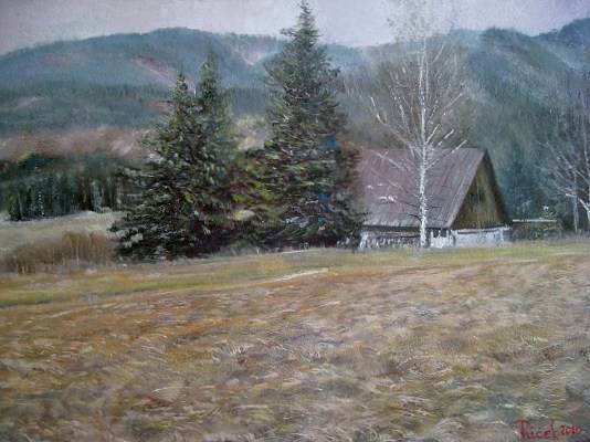 Na obrazie widać spokojną wiejską scenę z dominującymi odcieniami zieleni, brązu i niebiesko-szarymi tonami. Centralnym punktem kompozycji jest drewniana chata, otoczona majestatycznymi drzewami, które wydają się chronić ją przed światem. Gdzieniegdzie przebłyskują białe gałęzie brzóz, dodające malunkowi delikatności. Krajobraz rozpościera się ku dalekim, zamglonym górom, co nadaje mu głębi i intrygującego rozległego charakteru. Obraz emanuje ciepłą atmosferą nostalgii, a jednocześnie - z nutką melancholii, jakby czas stanął w miejscu. Artysta posłużył się techniką impasto, nanosząc farbę grubą warstwą, co daje wyjątkową fakturę. Ta technika dodaje życia i ruchu zarówno chatce, jak i polu na pierwszym planie. Kiedy na to patrzę, myślę o popołudniach spędzonych na wsi, czuć zapach wilgotnej ziemi i sosnowych igieł. To miejsce, gdzie można złapać oddech. A dziecko by powiedziało, że domek w lesie to fajna kryjówka! Kompozycja przypomina mi "freedom", taką wolność od miejskiego zgiełku. Ten obraz może wywołać uczucie spokoju i tęsknoty za prostymi chwilami, kiedy czas płynie wolniej. Czy nie byłoby cudownie zaszyć się w takiej chatce na weekend? Dzięki różnorodnym pociągnięciom pędzla, sceny nabierają życia i niemal czujemy, jak wiatr szumi wśród gałęzi. Nic, tylko patrzeć i się zachwycać.
