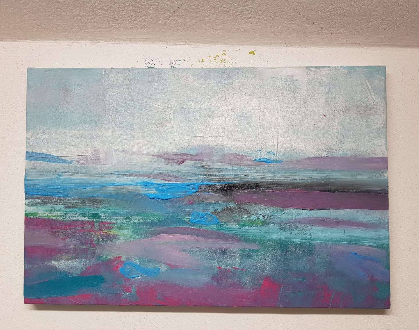 Obraz przed nami to niezwykła gra barw i form. Dominuje tu spokojna paleta odcieni błękitu, fioletu i zieleni, jakby artysta chciał ująć piękno poranka nad jeziorem. Pojawiają się też intensywne akcenty różu i niebieskiego, które przyciągają wzrok niczym małe fascynujace iskierki. Płótno zostało pokryte farbą w sposób swobodny, przypominający ruch pędzla w szerokich gestach, jakby artysta chciał uchwycić chwilę, a maybe nawet emocję. Ktoś mógłby powiedzieć, że obraz jest jak sen, spokojny i tajemniczy. Czujesz się jakbyś stał nad jeziorem, w którym odbijają się zamglone góry. Nastrój tego dzieła przywołuje spokój, ale i daje poczucie tajemnicy. Artystyczne podejście do kompozycji przypomina impresjonizm z nutą abstrakcji, co dodaje obrazowi głębi. To trochę jak zanurzenie się w cudownym świecie, gdzie można się zgubić na chwilę. Dla mnie osobiście obraz ten wywołuje uczucie nostalgii i zachwytu. Jeden z tych obrazów, na który patrzysz i czujesz, że jest po prostu „amazing”. Wszystko tutaj jest subtelne, ale mocne. Myślę, że nawet dziecko powiedziałoby: „To jak niebo po burzy!”. Coś w tym jest, prawda?