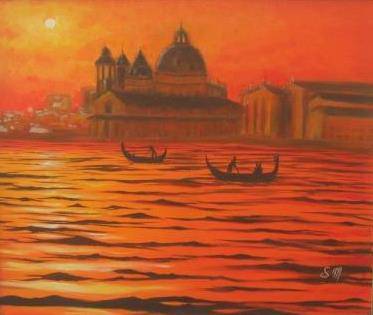 Obraz ukazuje monumentalny widok na miasto w ciepłych, płonących barwach zachodzącego słońca, które malują niebo na intensywny pomarańczowy i czerwony odcień. Na pierwszy plan wysuwają się łodzie, prawdopodobnie gondole, kołyszące się leniwie na falach lustrujących kolory wieczornego nieba. Dynamiczna powierzchnia wody przypomina ruchome złoto, a kontrastujące ciemne sylwetki budynków dodają obrazu dramatyzmu. Kompozycja jest przemyślana, z centralnym motywem kopuły, która unosi się nad horyzontem. Co za piękny obrazek! Całość emanuje spokojem, nostalgia połączona z lekkim zaskoczeniem. Klimat jest niemal magiczny, a technika artysty zdaje się podkreślać delikatność detali. Widz może poczuć lekką melancholię za kończącym się dniem, a jednocześnie ekscytację przed nadchodzącą nocą. Oil on canvas – tak, to na pewno olej, co widać po bogactwie kolorów i ich nasyceniu. Nie jest tu wszystko idealnie, jest jakby ze snu. Patrząc na obraz, można poczuć, jakby się tam było, na tej łodzi, czując na skórze ciepły powiew wiatru. Moje serce trochę zadrżało, przypominając sobie podobne chwile spędzone nad wodą. Obraz przykuwa uwagę swoją narracją wizualną, zostawiając miejsce na osobiste refleksje widza. Każdy kto na to spojrzy, pewnie pomyśli sobie "chciałbym tam być".