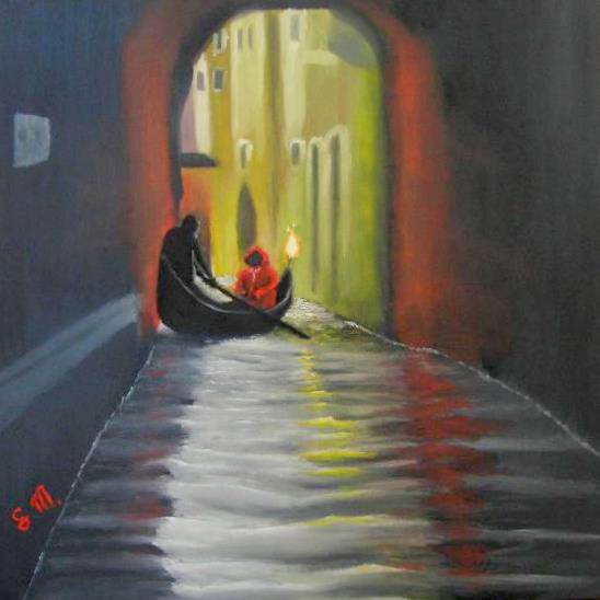 Na obrazie widzimy scenę z kanału, gdzie ciemna gondola sunie spokojnie przez wodę. Kolory dominujące to ciepłe odcienie brązu i zieleni, kontrastujące z żywą czerwienią postaci w łodzi. W tle widoczne są rozmyte kształty budynków, które tworzą łuk światła, dając obrazowi głębię. Atmosfera jest spokojna, prawie magiczna. Kojarzy się z wieczorną przechadzką w bajkowym mieście. Artysta zastosował technikę impresjonistyczną. Ślad pędzla jest swobodny, jakby chciał uchwycić chwilę, zanim ucieknie. Emocje, które obraz może wzbudzać, to poczucie tajemnicy i spokój. Osobiście, gdy patrzę na ten obraz, czuję nostalgiczną tęsknotę za miejscem, w którym nigdy nie byłem, ale zna je moje serce. Wyobrażam sobie, jak dziecko, że to wyprawa w magiczną podróż. "Patrz mamo, oni płyną do zamku!" mówiłby jakiś maluch. Ten obraz jest jak whisper, delikatnie szepcący do naszej wyobraźni, zachęcając nas do odkrywania jego historii. I chociaż technika malarska jest dość prosta, to właśnie w tej prostocie tkwi cały urok dzieła. Magiczny moment, zatrzymany na zawsze.