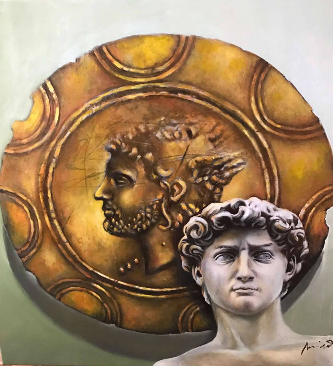 Obraz przedstawia elegancki dzbanek z połyskującego metalu, obok którego subtelnie spoczywają dojrzałe owoce – jabłko i gruszka. Tło jest stonowane, w odcieniach zieleni, z delikatnymi przejściami kolorów, co dodaje głębi i atmosfery tajemniczości. Ta kompozycja wydaje się być jakby zatrzymana w czasie, emanując spokojem i ciszą, którą niemal można usłyszeć. Światło odbijające się od powierzchni dzbanka tworzy feerię barw, dając wrażenie żywego obrazu. Kto wie, może właśnie to jest magiczne „shine” tego malarstwa. Styl przypomina impresjonizm, mimo że bardziej skoncentrowano się na dokładności detali, co może kojarzyć się z dawnymi mistrzami martwej natury. Patrząc na ten obraz, łatwo poczuć nostalgię i przypomnieć sobie babcine stoły pełne skarbów z ogrodu. W głębi duszy rodzi się myśl: jak piękne mogą być codzienne przedmioty, gdy spojrzymy na nie z innej perspektywy. Pewnie mały Wojtuś też mógłby to namalować, bo bardzo ładne. Całość budzi spokój i delikatną tęsknotę za prostą, choć piękną codziennością.