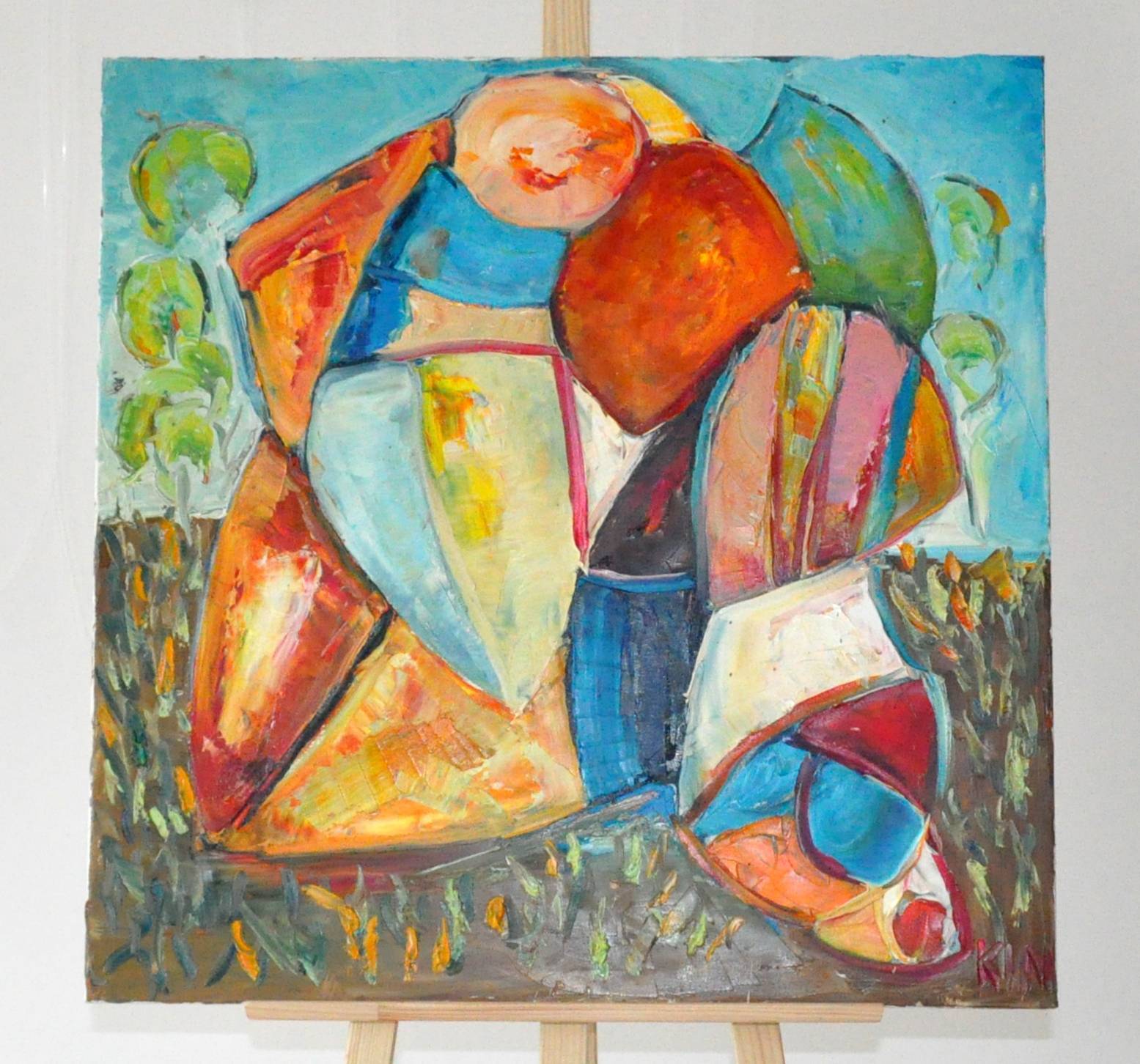 Na obrazie królują kolory: błękity, pomarańcze i zielenie. Te żywe plamy barw łączą się w kształty abstrakcyjne, które przykuwają wzrok i zmuszaja do dłuższego zanurzenia się w kompozycji. Dominują tu zaokrąglenia, kąty i kształty, jakby z surrealistycznego snu, które współgrają w dynamicznym balansie. Atmosfera obrazu emanuje energią i ciepłem, a jednak pozostawia nutę tajemnicy. Dzieło to przykład sztuki abstrakcyjnej, gdzie artysta wykorzystuje grubą fakturę farby, powodując że obraz zdaje się niemal trójwymiarowy. Emocje, jakie może wzbudzać to dzieło, to zarówno radość, jak i zaskoczenie. A może nawet chwila zamyślenia - co to wszystko znaczy? Czasem myślę, że sztuka jest jak magiczna zagadka bez jednej odpowiedzi. "Patrz, to jak kolorowa wysoka góra!" - powiedziałoby dziecko. Różnorodność elementów i kolorów sprawia, że obraz ma w sobie coś dynamicznego i playful. To dzieło potrafi wprowadzić odbiorcę w stan refleksji nad tym, jak różne elementy - choć chaotyczne - mogą tworzyć harmonijną całość.