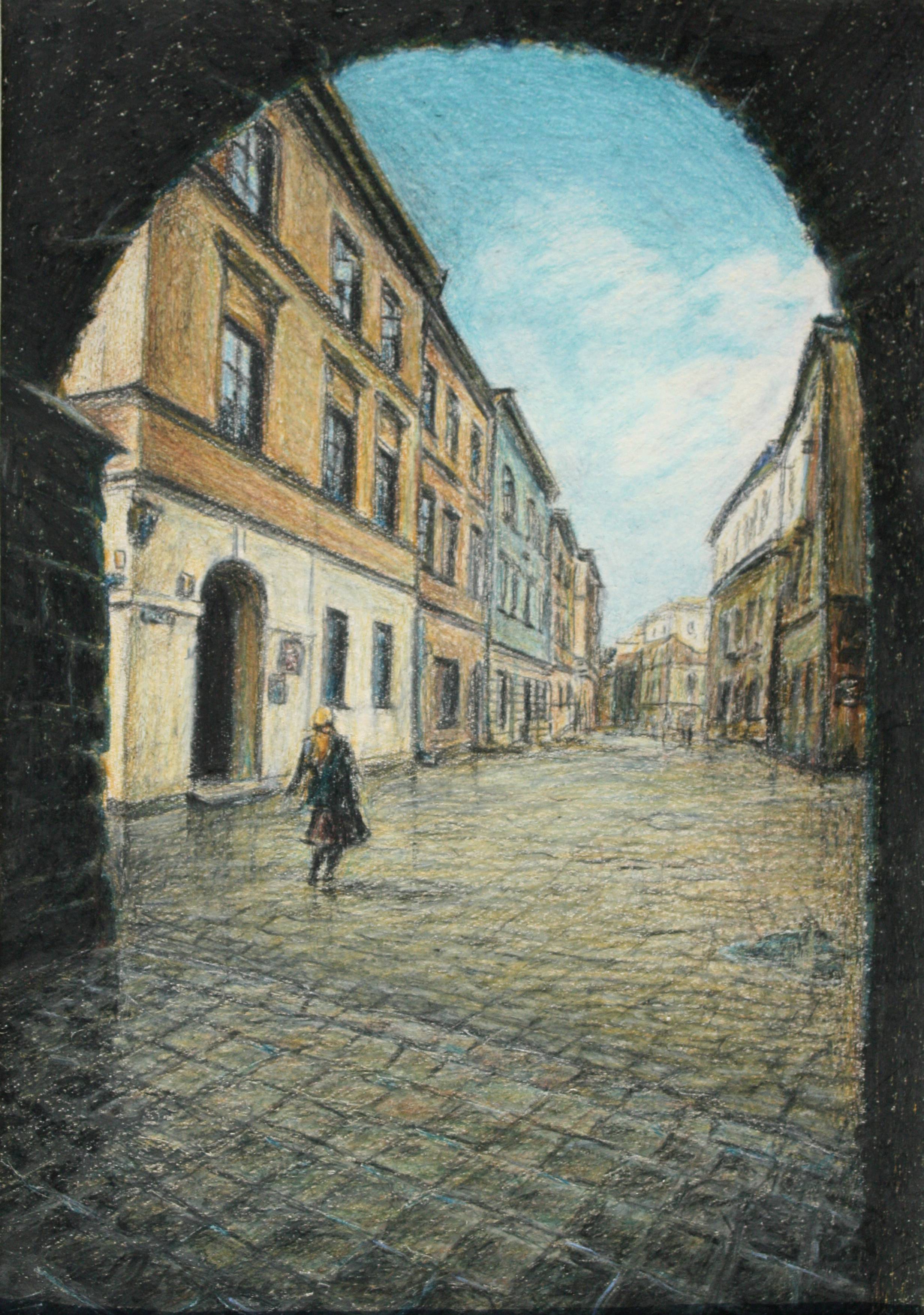 Widok z Bramy Krakowskiej na ulicę Bramową w Lublinie, 25 lat temu lubelska starówka była jeszcze bez reklam i krzykliwych szyldów. Obraz namalowany 1995 roku .