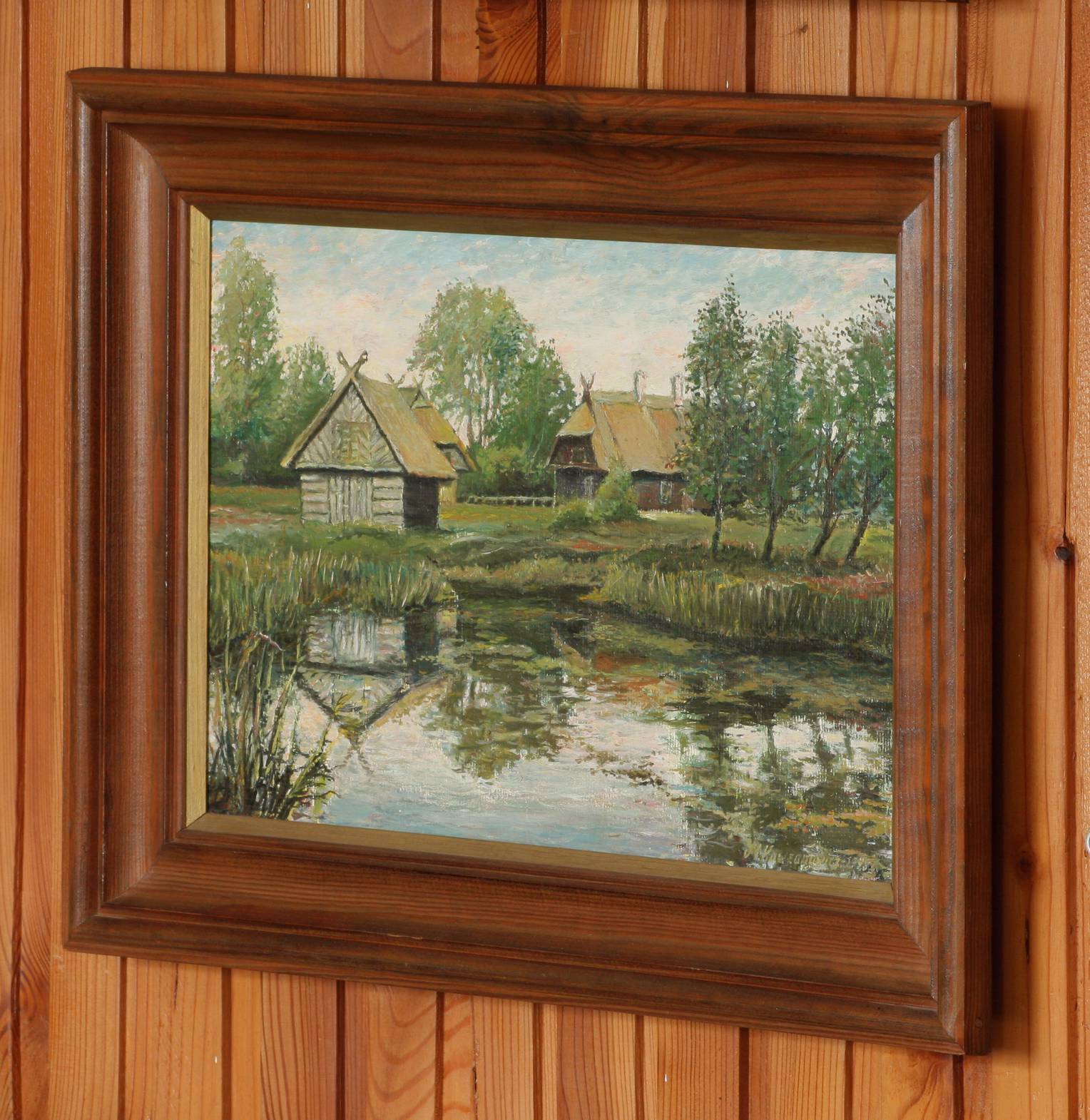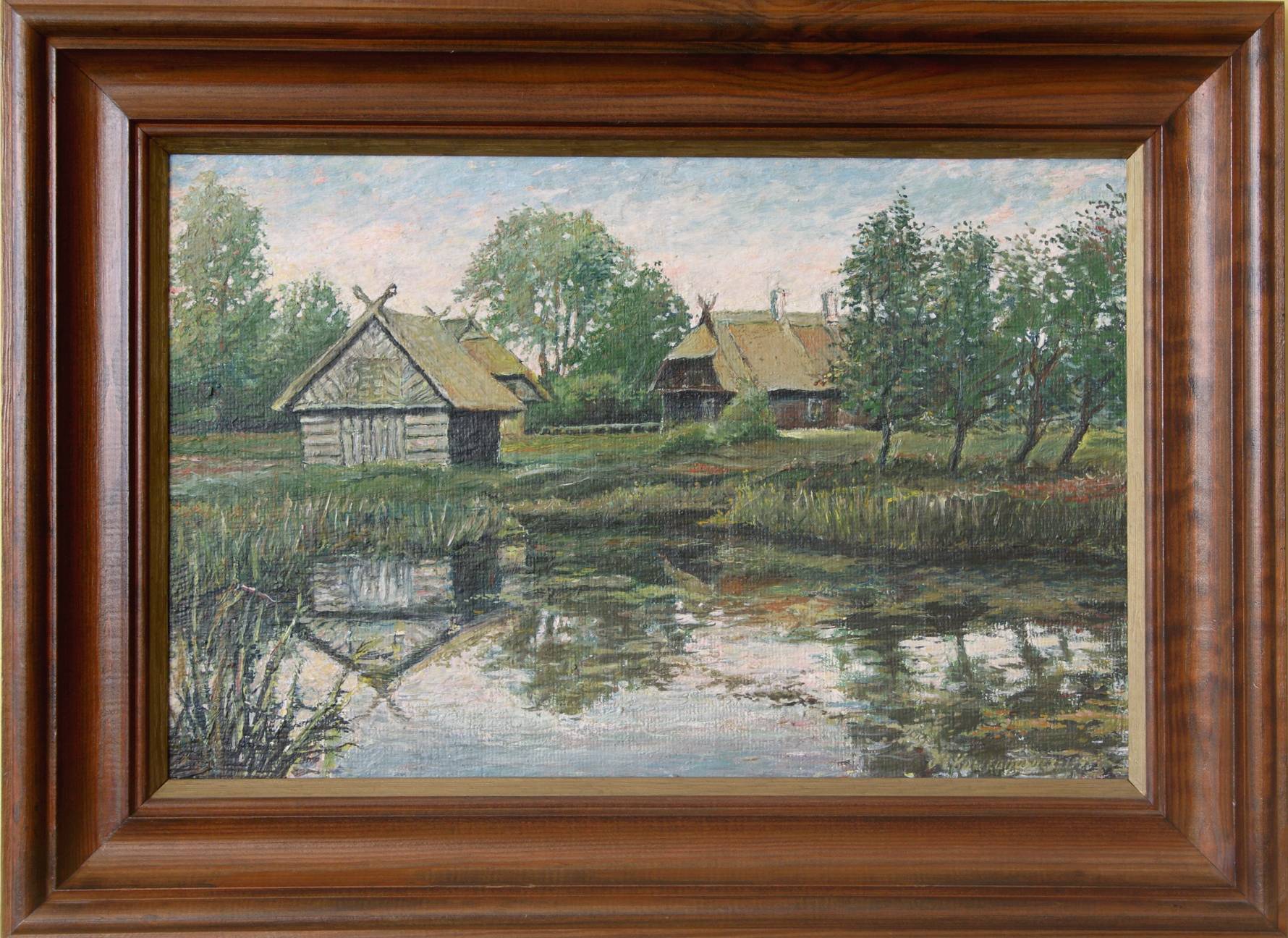 Obraz olejny przedstawiający jeden z zakątków w Skansenie Lubelskim, namalowany w 1998 roku, werniksowany . Oprawiony w ramę szerokości 6,2 cm.