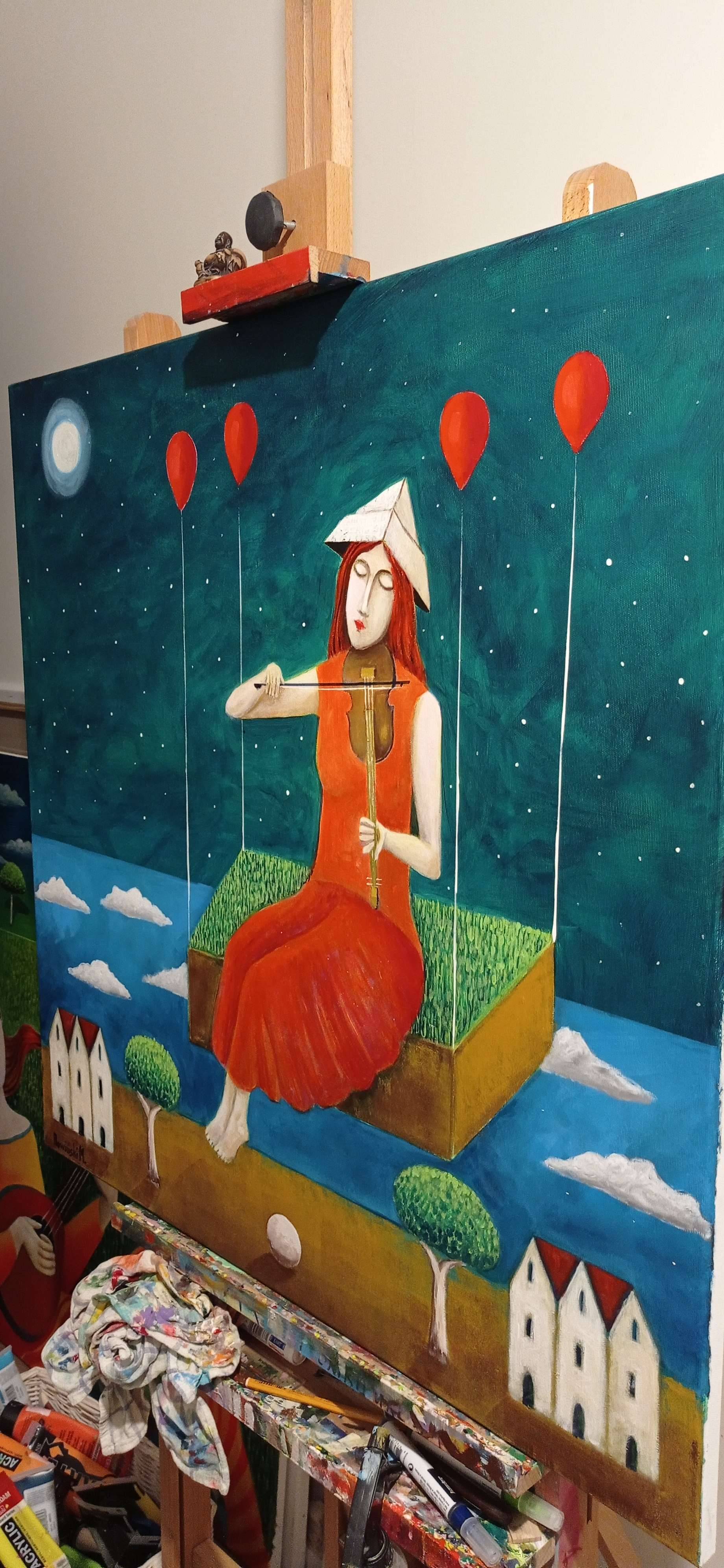 Na obrazie widzimy niezwykłą scenę nocy pełnej magii. Zielony kosmos u nieba, usiany białymi kropeczkami gwiazd, stwarza tło dla księżyca, który świeci delikatnym światłem. Centralnie usytuowana, postać w czerwonej sukni siedzi na unoszącej się platformie pokrytej zielenią. Jej beret z papieru przypomina dziecięce zabawy. Nieśmiałe uśmiechy ciepła przesyła za pomocą skrzypiec, które trzyma w delikatnych dłoniach. Otaczają ją unoszące się czerwone baloniki, jakby pilnowały jej spokojnego lotu. Atmosfera dzieła jest tajemnicza i trochę dreamlike, jak z krainy wyobraźni. Nastrój jest spokojny, a jednocześnie intrygujący, z delikatną nutą surrealizmu. Styl artysty charakteryzuje się prostą formą i żywymi kolorami. Kompozycja jest harmonijna, z wyważeniem między bajkową rzeczywistością a abstrakcją. Emocje, jakie obraz budzi, są nostalgiczne i zachwycają prostotą. Może przypominać o dziecięcych marzeniach, chwytających za serce i zostających w pamięci na zawsze. Można poczuć, jakby czas na chwilę się zatrzymał, dając przestrzeń do refleksji i spokoju. To trochę jak waking dream, w której wszystko jest możliwe. „Ta pani gra na skrzypcach i lata”, mógłby powiedzieć mały Jaś i miałby rację. Sztuka sprawia, że czujemy sie jak w bajce, otoczeni magią i ciepłem.