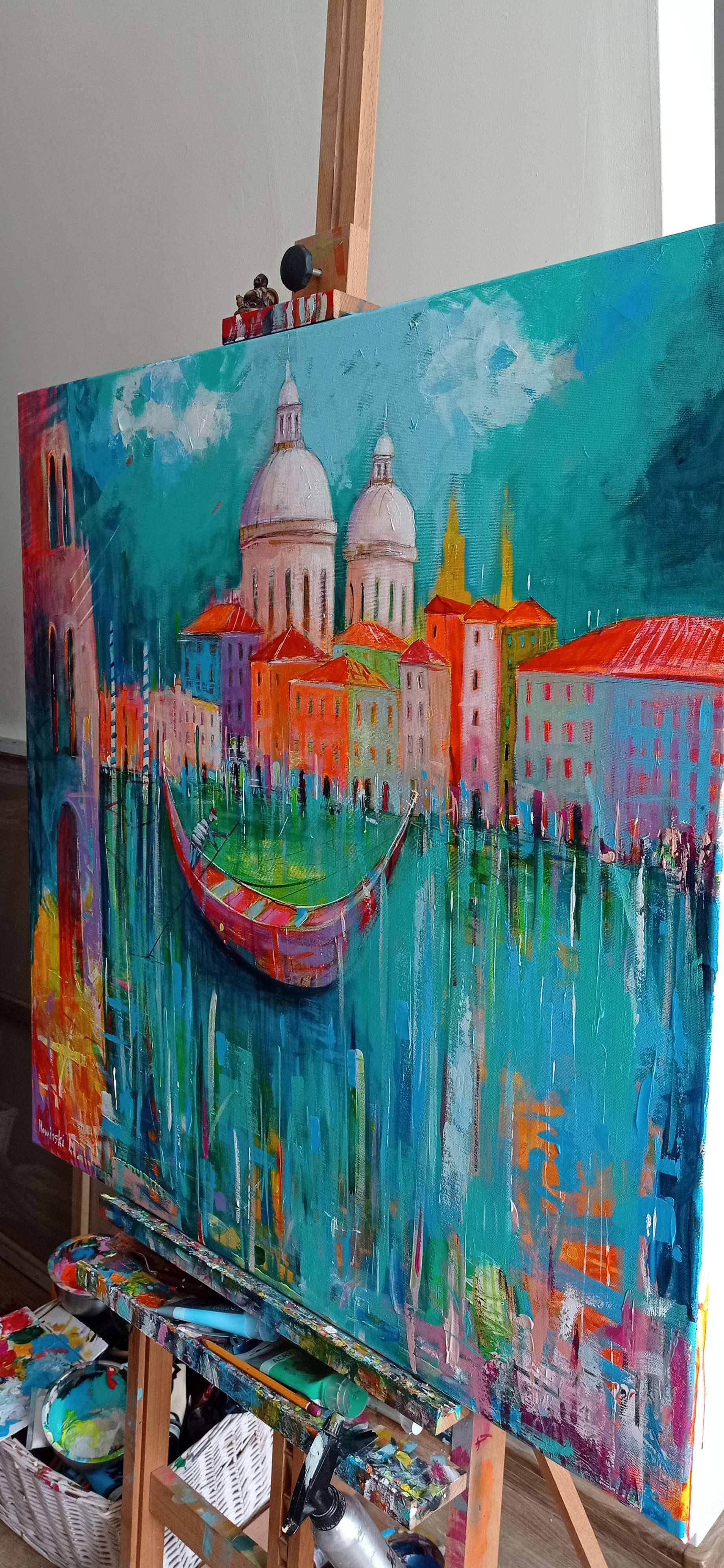 Na obrazie mamy prawdziwą eksplozję barw! To, co przyciąga wzrok od razu to intensywne turkusowe wody kanałów, które zdaje się, że niemalże wylewają się z płótna. Widzimy gondolę, majestatycznie ułożoną na przednim planie, z jej kolorowym pokładem. Po lewej stronie można zauważyć fragment architektury, w ciepłych tonach różu i pomarańczy. Dominuje malownicza martwa natura w postaci budynków z pomarańczowymi dachami i tajemniczymi białymi kopułami w tle. Atmosfera obrazu jest pełna życia i energii. Wydaje się, że artysta chciał uchwycić dynamiczną, tętniącą życiem duszę Wenecji. Te wszystkie kolory aż krzyczą „vibrant” i wprawiają widza w błogi nastrój. Styl, jakim posługuje się artysta, to ekspresjonizm z nutką impresjonizmu. Widać mocne, rozmazane pociągnięcia pędzla, które dodają całości chaotycznego wdzięku. Obraz może budzić w widzu uczucie radości, ale i lekkiego zdezorientowania. Dla siedmiolatka to jest miejsce, gdzie dzieci chętnie by popłynęły na wakacje! Obraz emanuje ciepłem, przywołując na myśl letnie dni w urokliwych zakątkach. Jakbyś patrzył na to, co jest kwintesencją beztroskiego, kolorowego lata w mieście nad wodą. Naprawdę magiczne!
