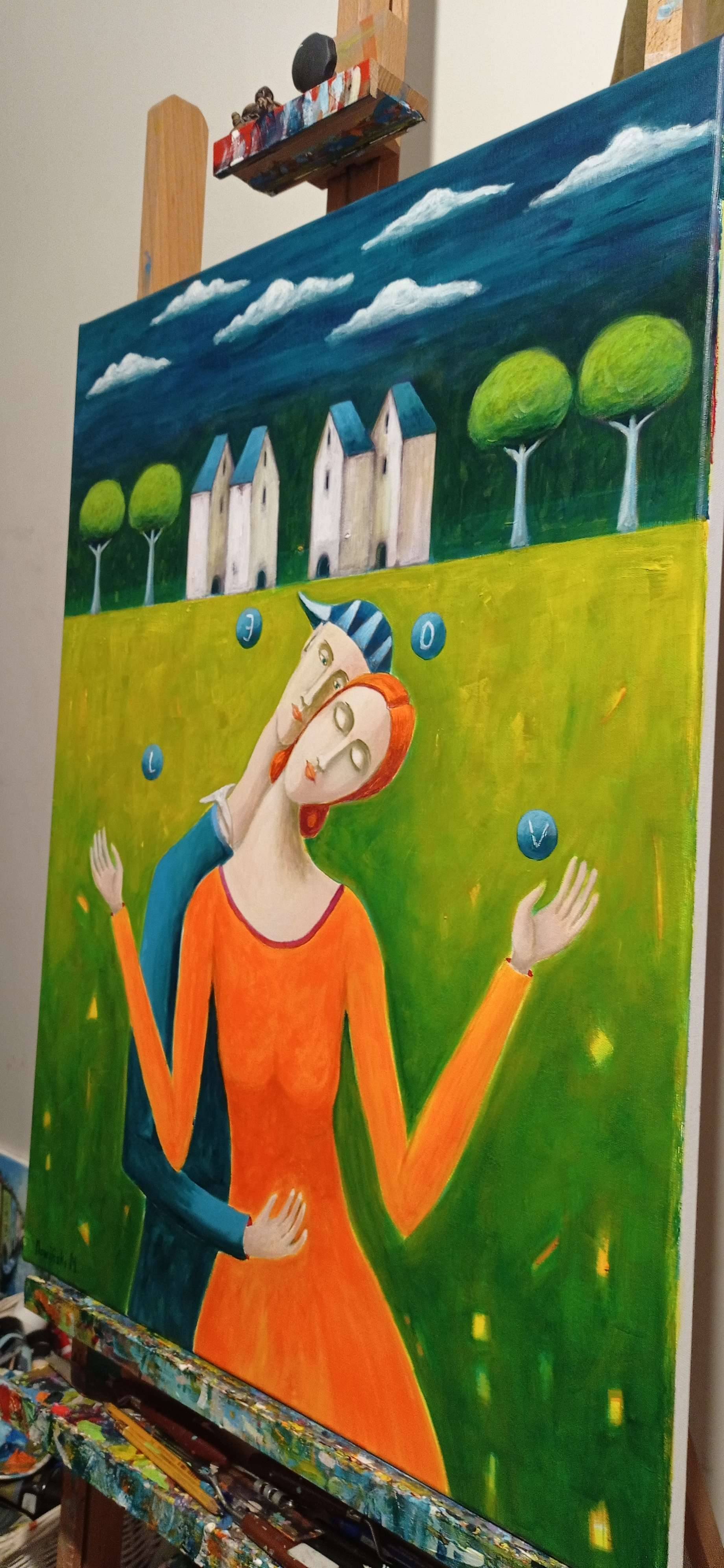 Na obrazie widoczna jest para w objęciu, ukazana na tle wiejskiego krajobrazu. Na pierwszym planie dominuje intensywny pomarańcz sukienki kobiety, kontrastujący z błękitem marynarki mężczyzny. W tle widzimy rząd białych, wysokich domów z dachami w kolorze zielonego błękitu, otoczonych rzędami symetrycznych drzew. Niebo jest nieco pochmurne, z małymi puszystymi chmurkami, co dodaje spokojnej atmosfery. Obraz emanuje spokojem i sielanką. Para wygląda na zrelaksowaną, z zamkniętymi oczami, jakby odpoczywała w objęciach natury. Technika artystyczna jest dość płynna. Artysta posłużył się łagodnymi przejściami między kolorami, tworząc delikatny i oniryczny efekt. Kolory są nasycone, ale jednocześnie niekrzykliwe, harmonizują ze sobą. Obraz może wywoływać u odbiorców uczucie nostalgii za prostymi chwilami szczęścia. Wyobraź sobie taki idylliczny "landscape" – czuć tu powiew wolności i radości. Dziecko mogłoby powiedzieć: "Pani w pomarańczowym się śmieje, bo pan ją kocha”. Patrząc na tę scenę, możemy poczuć ciepło i miłość rozlewające się po całej kompozycji. Jest coś magicznego, co sprawia, że chce się tu być, choć tylko przez chwilę.
