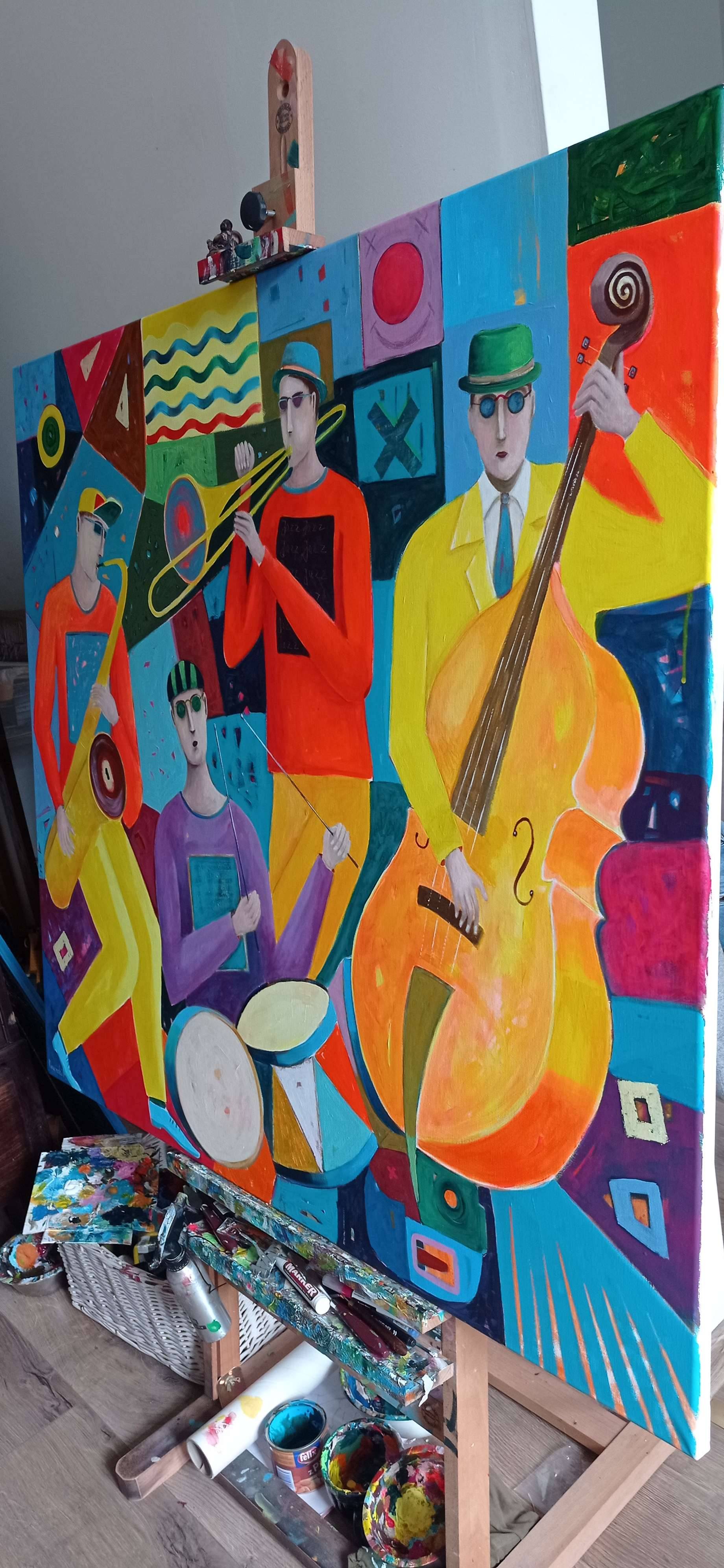 Ten obraz to prawdziwa eksplozja kolorów i energii. Na pierwszy rzut oka w oczy rzuca się żywy mix barw: pomarańcze, żółcie, zielenie i niebieskości. Dominują mocne kontrasty, które przypominają wirującą kalejdoskop emocji. Czterech muzyków, każdy z zaawansowanym instrumentem, zastało uchwyconych w chwili muzycznego uniesienia. Ich kanciaste sylwetki i geometryczne kształty nadają kompozycji abstrakcyjny wyraz. Atmosfera jest niesamowicie dynamiczna, jakby każdy dźwięk instrumentu ożywiał płótno. W obrazie czuć inspirację kubizmem - ostre linie, przerysowane formy, a jednak pełne harmonii. Obraz może wzbudzać radość i przypływ energii, ale też trochę melancholii dla tych, którzy doszukują się czegoś głębszego. "Grają fajnie na trąbkach!", mógłby zawołać siedmiolatek. Dzieło emanuje rytmem, który niemalże czuć pod stopami. Artysta użył techniki, która przenosi nas do świata pełnego "vibe'u". Z każdą chwilą można odkrywać nowe szczegóły i interpretacje. Aż chciałoby się zakuć w taneczną fiestę.