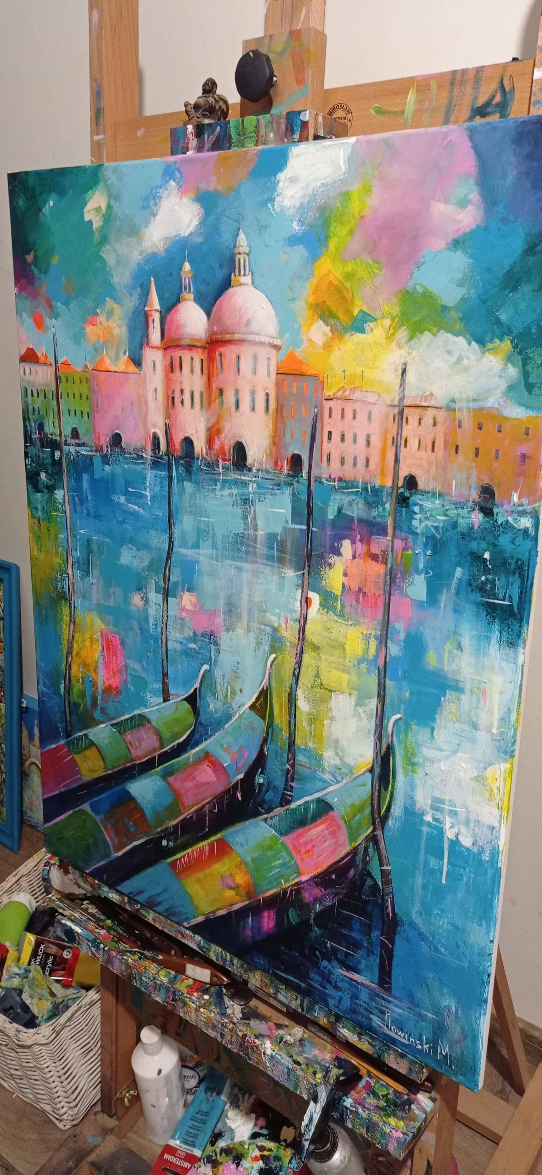 Obraz jest jak sen o Wenecji: pełen kolorów i magii. Na pierwszym planie, mamy gondole, które zdają się tańczyć na falach. Ich kolory są niezwykle żywe: zielony, turkusowy, ciepły róż. W tle widzimy okazałe budynki z puklerzami kopuł, które jakby mówiły: "Patrzcie na nas!". Ich pastelowe kolory delikatnie odbijają się w wodzie, tworząc kalejdoskop barw. Atmosfera tutaj to spokój zmieszany z odrobiną melancholii, jakby miasto od wieków trwało w swym pięknie. Styl artysty przypomina impresjonizm. Pociągnięcia pędzla są szybkie, dynamiczne, a każde z nich dodaje energii całej scenie. Patrząc na ten obraz, trudno się nie uśmiechnąć. Słońce maluje na wodzie motyle barw, a jedna z gondoli zdaje się mówić "let's go for a ride!". Dla dziecka, to miejsce pełne tajemnic. "Mamo, a czy tam pływają syrenki?" zapytałoby z zachwytem. Obraz zaprasza do marzeń, do niezwykłej podróży, gdzie czas płynie inaczej. A Ty, co o czym teraz marzysz, patrząc na to arcydzieło?