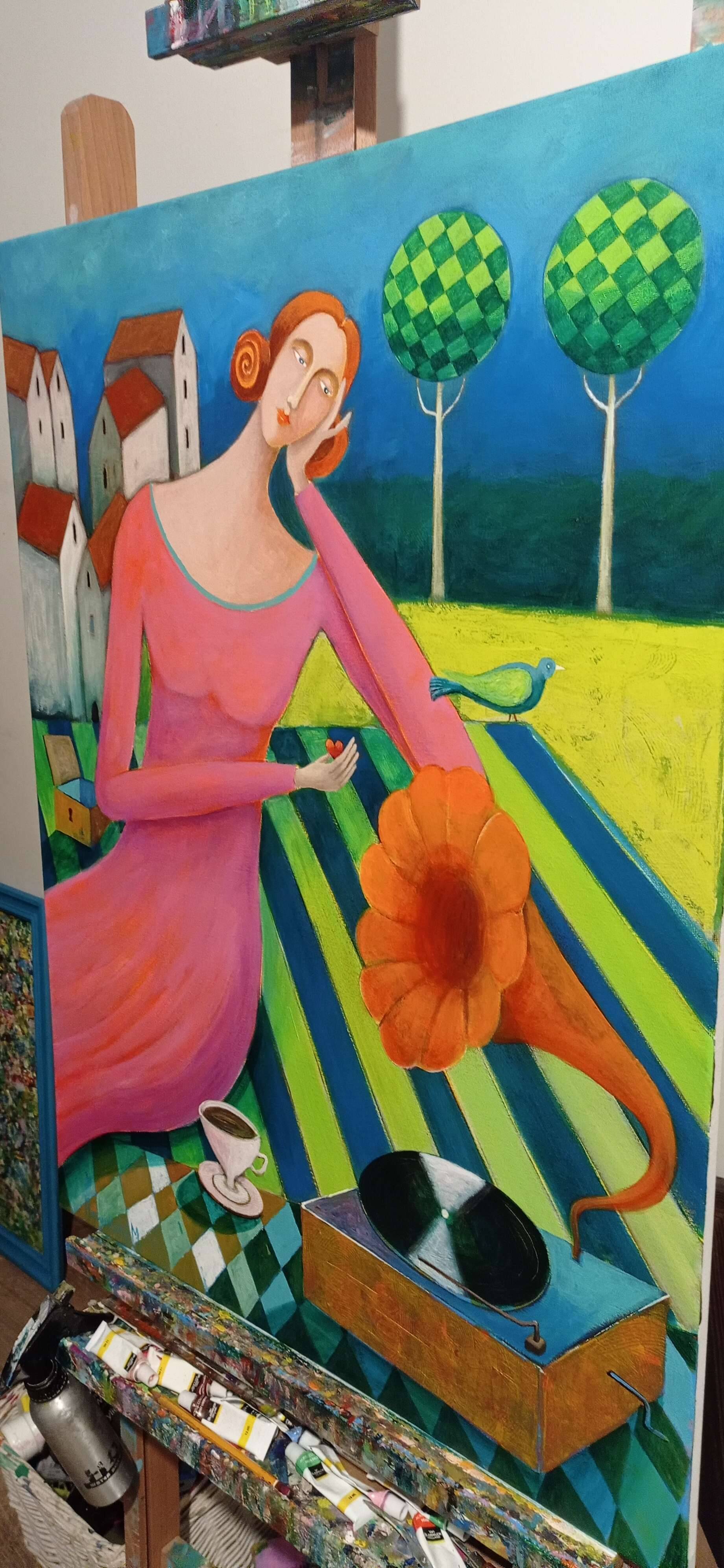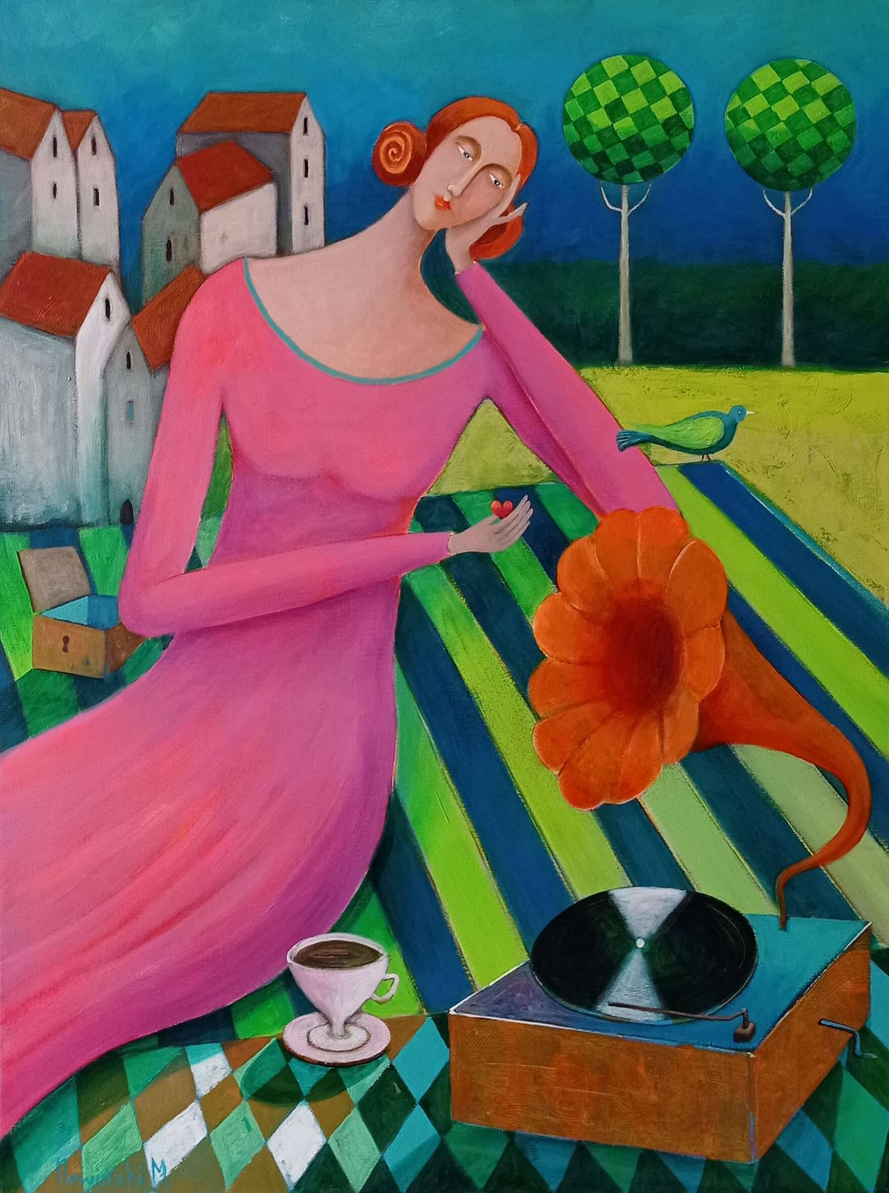 Na obrazie dominuje intensywność kolorów, jest żywo i radośnie. Kobieta w różowej sukni przyciąga wzrok, jej smukła sylwetka kontrastuje z dynamicznym tłem w zieleniach i błękitach. Ciekawy jest motyw gramofonu, którego pomarańczowy róg niemal śpiewa, a siedzący obok ptak dodaje sielskiego uroku. Budynki w tle są małe, jakby tam tylko dla ozdoby, przypominają miasto z bajki. Atmosfera bijąca z obrazu to nostalgia, ale taka jakby z lekkim przymrużeniem oka. Coś jak dream z dawnych lat. Styl artystyczny mocno przypomina surrealizm. Szczególnie te przesadzone proporcje i nietypowa perspektywa. Przemyślane użycie nasyconych kolorów przydaje całości uczucia świeżości. Można poczuć się jakby zaraz miał się wydarzyć coś magicznego. Kojarzy mi się to troszkę z dzieciństwem. Jak babcia puszczała płyty w starym gramofonie, to były chwile. Ten obraz może budzić mieszane emocje. Z jednej strony czuć spokój i harmonia, z drugiej strony jest w tym coś tajemniczego. Osobiście, uważam że to po prostu "happy place", taki kawałek szczęścia i wspomnień.