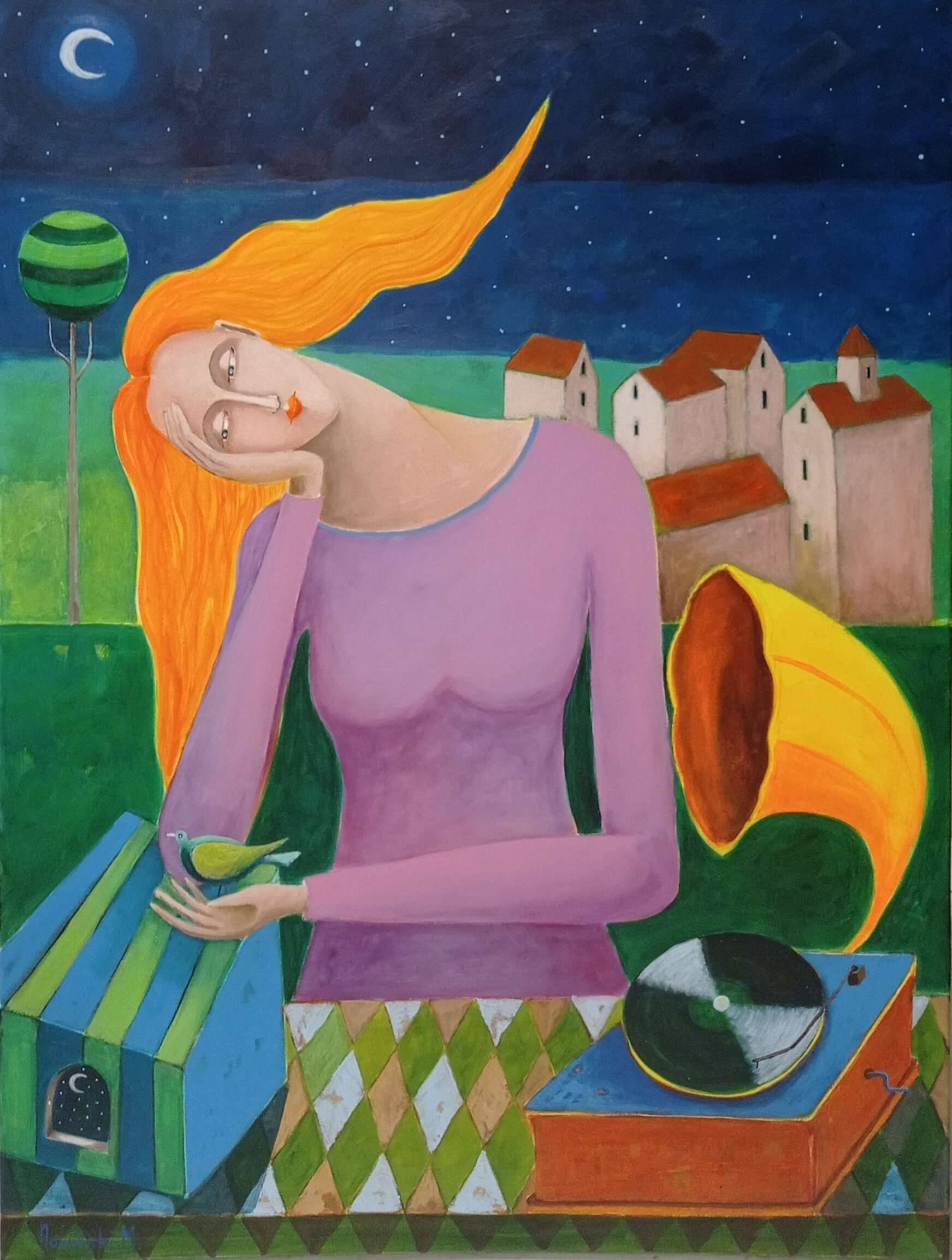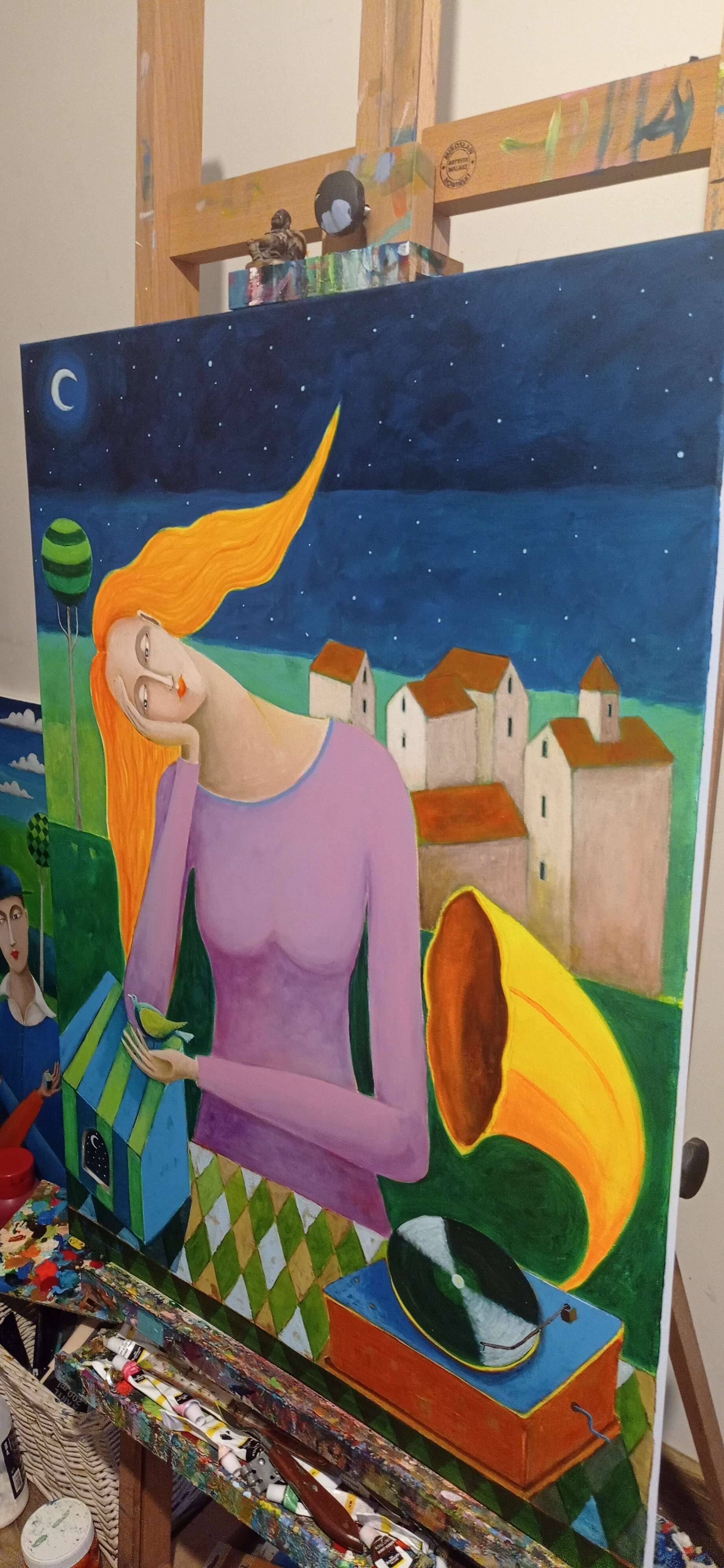 Obraz przedstawia intrygującą scenę wypełnioną żywymi kolorami i geometrycznymi kształtami. Na pierwszym planie, postać o pomarańczowych włosach spływających niczym płynne złoto, siedzi przy stoliku, na którym widać małego ptaszka i gramofon. Stół pokryty jest wzorem przypominającym szachownicę w odcieniach zieleni, bieli i błękitu. Na tle widać małe domki z czerwonymi dachami pod ciemnogranatowym niebem, a w oddali świeci księżyc w kształcie rogalika. Klimat obrazu jest nieco tajemniczy, jak spokojna noc pełna ukrytych marzeń. Styl artysty zdaje się być inspirowany surrealizmem, z nutą naiwnego malarstwa. Proste, ale jednocześnie przesycone emocjami kształty przyciągają wzrok i sprawiają, że trudno się oderwać. Obraz może budzić różne emocje – od spokoju aż po nutkę nostalgii za dzieciństwem. Ja też chcę mieć kolorowe włosy! Powiedziałoby z pewnością dziecko, zachwycone niecodziennością sceny. Moja pierwsza myśl: "jakie to dreamy". Czuje się jakby sztuka przemawiała bez słów, z lekkością dotykając tajemnic życia codziennego.