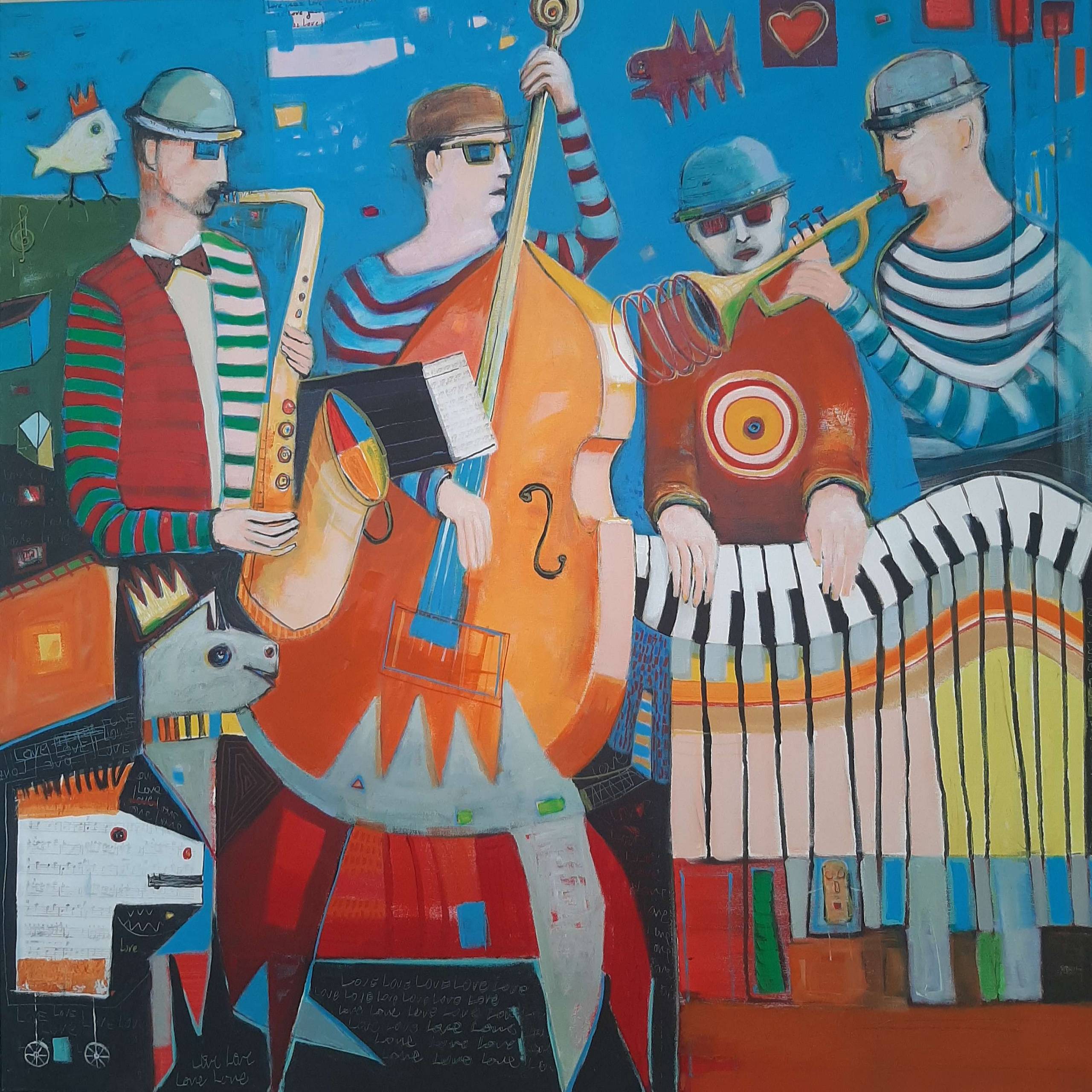 Obraz tętni życiem! Zauważ, jak dominują na nim intensywne kolory: głęboki błękit, ogniste pomarańcze i energiczne czerwienie. Kompozycja jest dynamiczna, pełna kontrastów i harmonii zarazem. Postacie muzyków w dziwacznych kapeluszach, z instrumentami w rękach, wydają się niemalże odrealnione. Saksofon, kontrabas, trąbka i klawiatura zlewają się w jedną symfonię barw. Na dole, nieco groteskowy koń z koroną dodaje humorystyczny akcent. O patrzcie, król koń! Atmosfera jest wręcz magiczna, pełna beztroskiej radości i swingu. Nieformalny styl artystyczny przywodzi na myśl dzieła inspirowane surrealizmem. Artysta użył technik mieszanych, łącząc płaskie powierzchnie z dynamicznymi liniami. To jazzy! Czuć lekkość i ironiczne spojrzenie na świat. Obraz wywołuje ciepło i uśmiech. Jest tu coś z dziecięcej radości grania na niewidzialnych instrumentach. Wyobrażasz sobie ten koncert w kolorowym świecie, gdzie wszystko jest możliwe. A może po prostu wspominasz dzieciństwo i zabawy na podwórku. W każdym razie, chcesz do tego świata wskoczyć choć na chwilę.