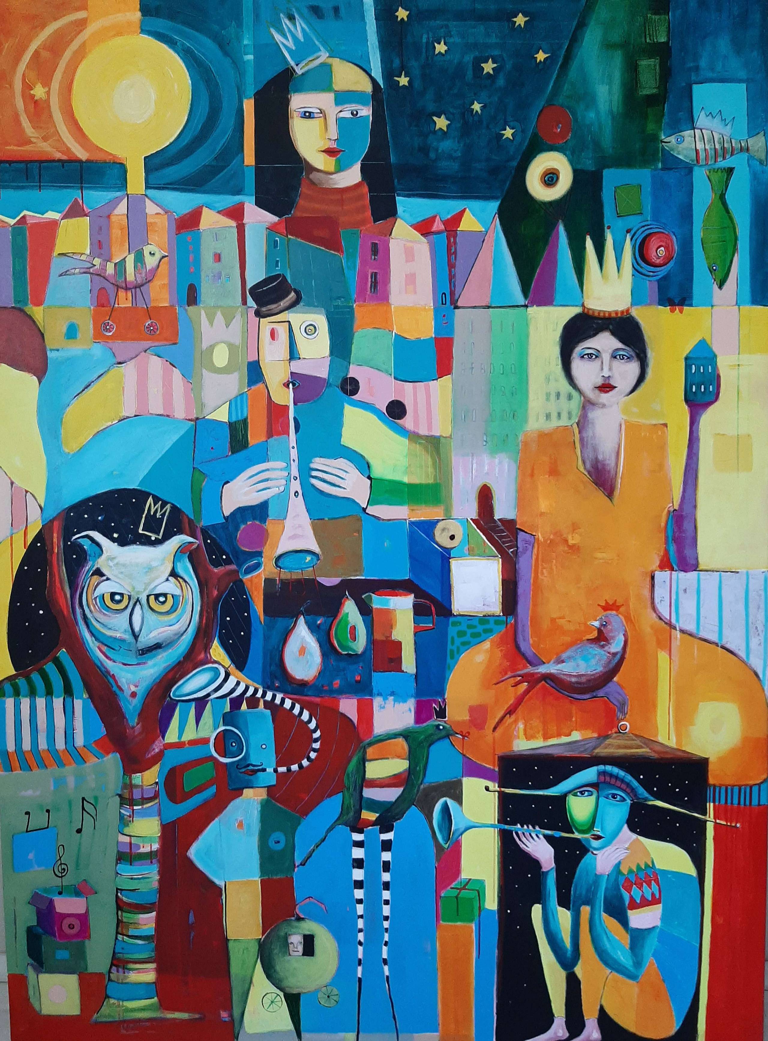 Obraz jest jak kalejdoskop barw. Kolory przeplatają się, tworząc mozaikę pełną życia i energii. Dominują intensywne odcienie niebieskiego, pomarańczowego i zielonego, między nimi pojawiają się akcenty żółci i czerwieni. Kompozycja jest pełna geometrycznych kształtów, które układają się w intrygujące wzory. Atmosfera obrazu przypomina senne marzenia, odrywające się od rzeczywistości. Postacie są niczym z bajki, z koronami, instrumentami i tajemniczymi przedmiotami. Ich twarze emanują spokojem, choć tło jest pełne chaosu. Artysta zastosował techniki przypominające kubizm, z odważnym wykorzystaniem kolorów i form. Obraz może wywoływać całą gamę emocji – od zachwytu po zdziwienie. Wygląda jak "silent movie" w malarskiej odsłonie. Dla małego dziecka obraz mógłby być jak wycieczka do krainy, gdzie ludzie są przyjaciółmi zwierzątek. Myślę, że nie da się oderwać wzroku.