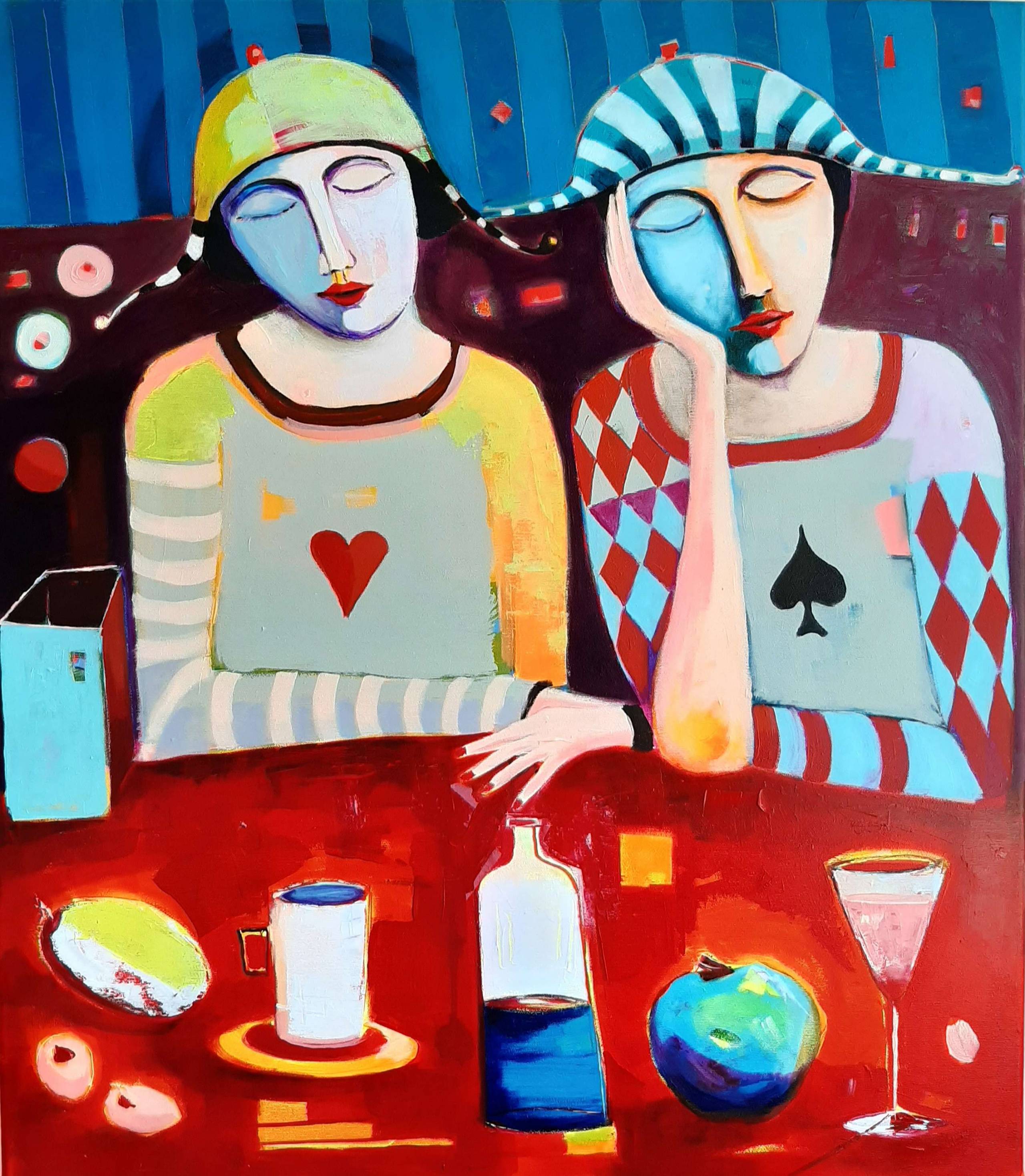 Na tym pełnym życia obrazie dominują intensywne kolory: czerwienie, błękity i zielenie, tworząc frapującą kompozycję. W centrum dwie postacie w fantazyjnych nakryciach głowy. Tło kontrastuje z ich jasnymi twarzami - to jakby sceneria magicznego snu. Te prostokątne formy nawiązują do jakiejś gry, może? Atmosfera jest zaskakująca, mieszanka beztroski i zamyślenia. Obraz emanuje spokojem, ale i trochę tajemnicą, coś jak “what’s next?”. Techniką to może ekspresjonizm, z odrobiną surrealizmu. Tak sobie myślę. Patrząc na serce i treflę na ubraniach, czuję symbolikę, może jakaś gra miłosna? Dzieło pobudza wyobraźnię, oddziałując na emocje - trochę nostalgia, trochę radość. Różnorodność kształtów stwarza wrażenie ruchu i dynamiki. Jak siedmioletnie dziecko by to ujęło: "To wygląda jak zabawa w karty z dziwnymi kapeluszami i kosmicznym stołem!". To po prostu coś, co przyciąga uwagę i każda interpretacja zdaje się być właściwa.