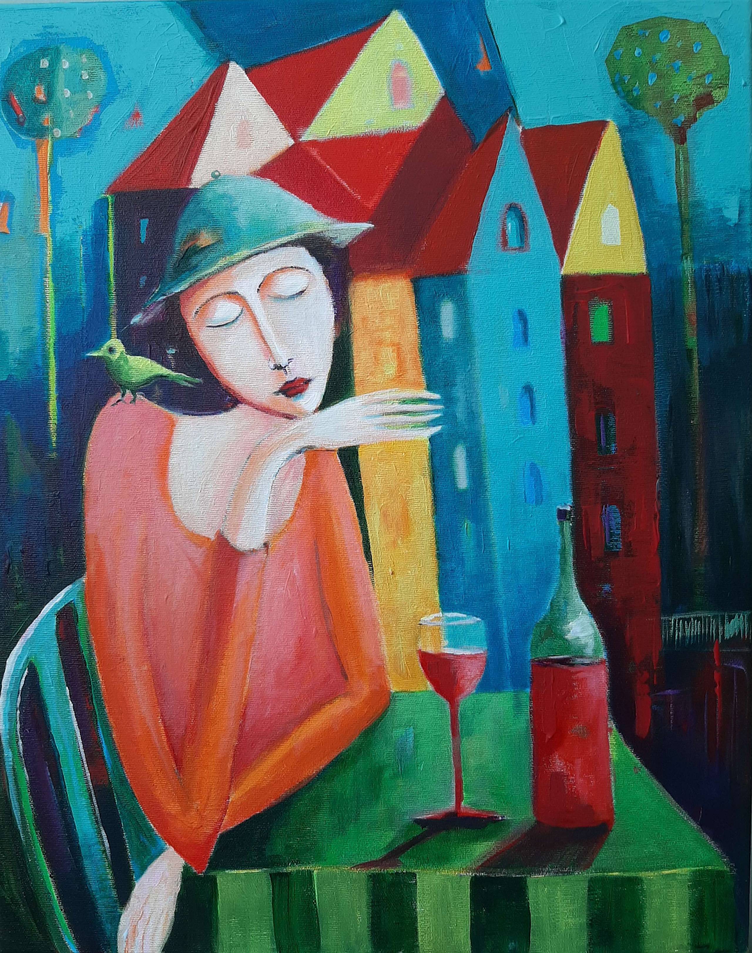 Na obrazie widzimy postać siedzącą przy stoliku o zielonym obrusie. Na tym stoliku stoi butelka oraz kieliszek czerwonego wina. Postać ma zamknięte oczy i lekko pochyloną głowę, co nadaje jej melancholijny wyraz. Na ramieniu siedzi mały, zielony ptaszek. W tle widnieje kolorowa zabudowa złożona z domków w odcieniach niebieskiego, czerwieni i żółci, które przypominają dziecięce wycinanki. Drzewa o geometrycznych kształtach dodają abstrakcyjnego klimatu. Kolory są żywe i kontrastowe, co przyciąga wzrok. Obraz emanuje spokojem i refleksją. Może wywoływać uczucie nostalgii, a może i marzenia o letnich wieczorach spędzanych w kawiarnianym ogródku. Styl artystyczny jest na pograniczu kubizmu i ekspresjonizmu, z wyraźnymi liniami i zniekształconymi proporcjami. Artysta użył techniki impasto, co nadaje głębi i struktury. Patrząc na to dzieło, można poczuć się jak w bajce. Nagle czujemy, że ten ptaszek to nasz przyjaciel, a wino smakuje jak magiczny eliksir. W głowie siedmiolatka pojawiłaby się może taka myśl: "Chciałbym tam być i porozmawiać z ptaszkiem!". Może to obraz, który mówi nam, by cieszyć się małymi rzeczami – a może tylko ja tak myślę. Jego magiczny "touch" sprawia, że serce robi się cieplejsze. To dzieło, które żyje i oddycha, opowiadając swoją cichą historię.