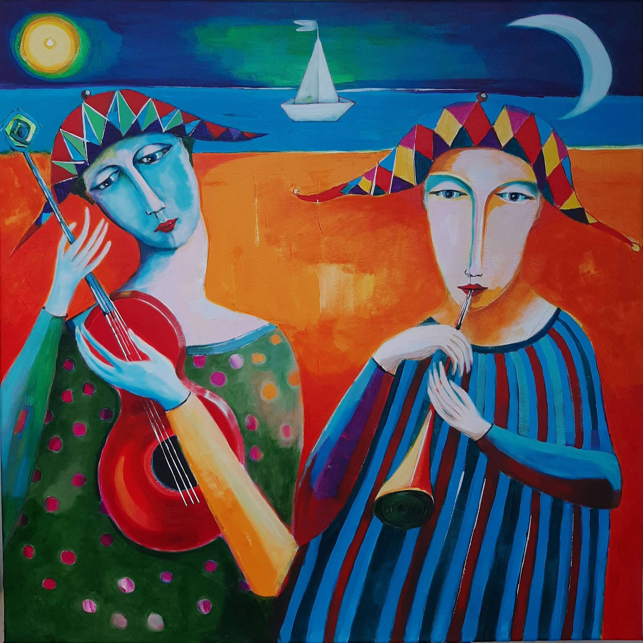 Na obrazie dominuje intensywna paleta kolorów, pełna kontrastujących odcieni niebieskiego, pomarańczowego i czerwieni. Postacie o geometrycznych kształtach nadają całości nieco surrealistyczny charakter. Jeden z nich gra na czerwonym instrumencie, a druga osoba dmucha w flet, co tworzy atmosferę artystycznego wyrafinowania. Patrząc na to dzieło, czujemy się jak na koncercie w magicznej krainie. Artysta zastosował technikę przypominającą kubizm, gdzie kanciaste formy i plamy kolorów łączą się w dynamiczną kompozycję. Przywodzi to na myśl Pablo Picasso i jego eksperymenty z przestrzenią i kształtami. Obraz zdaje się mówić "feel the rhythm", zachęcając do zanurzenia się w jego muzycznym świecie. Dzieło może wzbudzać różnorodne emocje. Może wywołać radość piękna chwili, ale także nostalgię za utraconym czasem. Czuję, jakby ten obraz śpiewał. "Ja też potrafię, mamo!" Tak by powiedziało dziecko, patrząc na to bajeczne przedstawienie. Obraz przemawia językiem kolorów, grając symfonię wizualnych wrażeń. To niezwykłe, jak sztuka potrafi przenieść nas w świat marzeń.