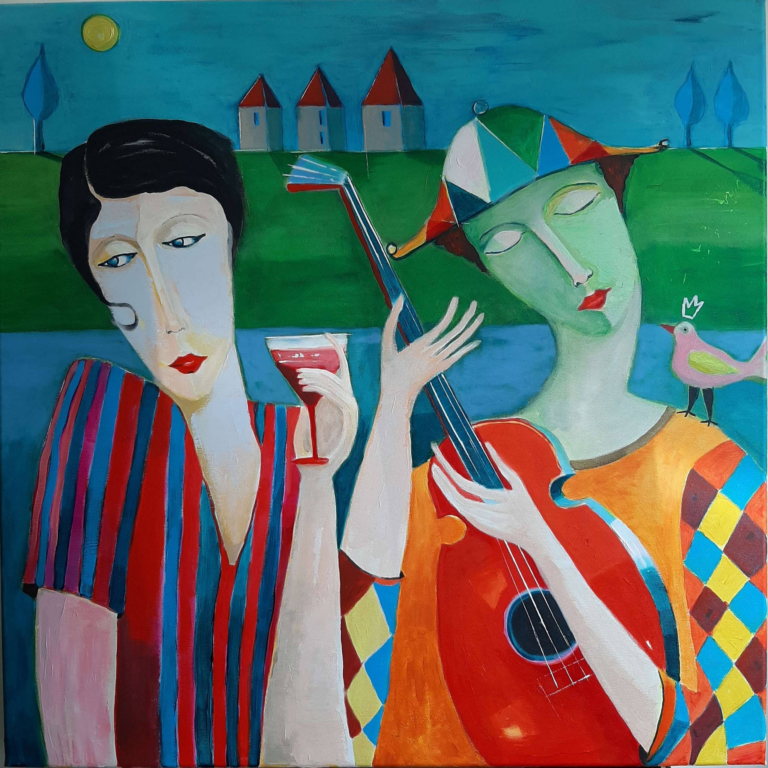 Na tym obrazie dominuje feeria kolorów. Wyrazista paleta barw – czerwienie, zielenie, błękity – sprawia, że całość przyciąga wzrok. Dwie postaci, jedna trzyma kieliszek wina, druga gra na gitarze. Ich twarze mają pastelowe odcienie, co dodaje delikatności i jakby lekkości całości. Kompozycja jest zrównoważona, z subtelną linią horyzontu w tle, którą urozmaicają minimalistyczne domki i smukłe drzewa. Nastrój obrazu jest jakby senny, takie trochę surreal. Postacie wyglądają na zamyślone, może nawet troszkę melancholijne. Styl artysty przypomina naiwne malarstwo, gdzie perspektywa i proporcje schodzą na dalszy plan. Brushstrokes są dość wyraziste, a kolory celowo uproszczone, co tworzy niepowtarzalny efekt artystyczny. Dzieło może wywoływać różne emocje – od radości po zadumę. Może to wspomnienie letnich wieczorów przy winie i muzyce? To jak koncert na łące. Ptaki też lubią śpiewać. Myślę sobie "kurde, chciałbym być tam teraz". Obraz potrafi wzbudzić nostalgię. Widz może interpretować go jako symbol wolności i beztroski. Dla innych będzie to escape from reality. Urok tej sceny tkwi w jej prostocie połączonej z bogactwem kolorów i lekkością.