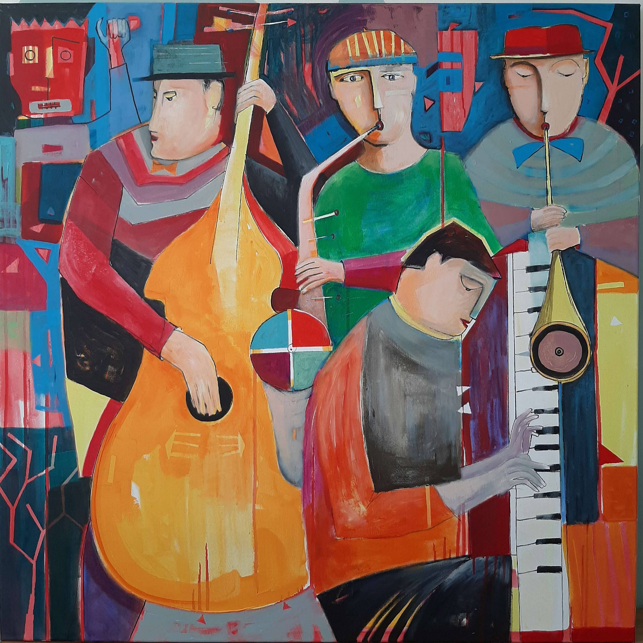 Obraz przedstawia energetyczną scenę muzyczną, w której cztery postacie grają na różnych instrumentach. Kolory są żywe i kontrastujące: widzimy intensywne odcienie czerwieni, niebieskiego i zieleni. Muzycy są ujęci w dynamicznych pozach, co nadaje kompozycji poczucie ruchu i rytmu. Czuć tu duch jazzu. Atmosfera jest żywiołowa i pełna pasji. Tak jakbyś nagle znalazł się w zatłoczonym klubie, gdzie muzyka porywa do tańca. Technicznie rzecz biorąc, artysta używa prostych form i wyrazistych konturów, co przypomina nieco kubizm. Obraz może wzbudzać różne emocje. Dla niektórych to radość i energia, dla innych nutka nostalgii za dawnymi czasami bohemian lifestyle. Dzieciak mógłby powiedzieć: "Oni grają jak kolorowe lalki!" Styl obrazu jest unikalny, trochę na pograniczu abstrakcji, ale zrozumiały. Można dostrzec jak artysta bawi się formą i kolorem, tworząc coś, co jest both harmonijne i chaotyczne. Osobiście, czuję się jakby muzyka dosłownie ożywała na płótnie.