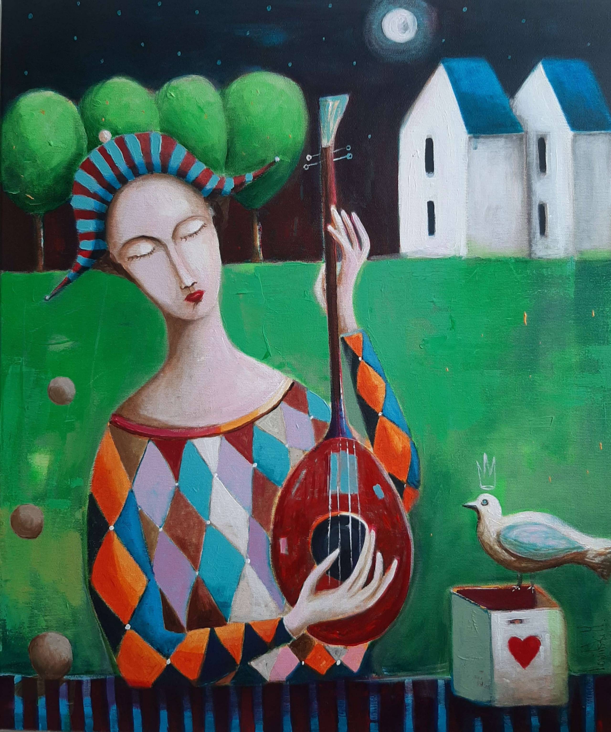 Obraz tętni kolorami. Na pierwszym planie widzimy postać w kostiumie arlekina, trzyma guitar-like instrument. Kolory stroju to mieszanka żywych pomarańczy, turkusowych błękitów i głębokiej czerni, które tworzą hipnotyzujący wzór rombów. W tle zielone drzewa, przypominające puchate kule, oddzielają postać od dwóch białych domów z niebieskimi dachami. Nocne niebo usiane jest maleńkimi gwiazdkami, a księżyc rzuca delikatny blask. W tym dziele czuje się senną magię. Atmosfera jest tajemnicza i odrobinę surrealistyczna. Artysta używa techniki mieszania płaskich plam barw z delikatnymi przejściami, co nadaje obrazowi dreamlike charakter. Improwizacyjne pociągnięcia pędzla dodają mu pewnej dynamiki, choć całość pozostaje w spokoju. Obraz może budzić różne emocje. Z jednej strony jest radość i beztroska dzięki żywym kolorom. Z drugiej, pewna nostalgia, szczególnie gdy spojrzymy na zamyśloną twarz muzyka. "Ten ptaszek pewnie śpiewa pięknie", pomyślałoby dziecko. Można się zastanawiać, o czym śni postać. Wszystko razem twarzy, że odbiorca czuje się jakby zaglądał do magicznego świata pełnego sekretów i marzeń. To myśli, które pozostają z nami na dłużej po odejściu od obrazu.