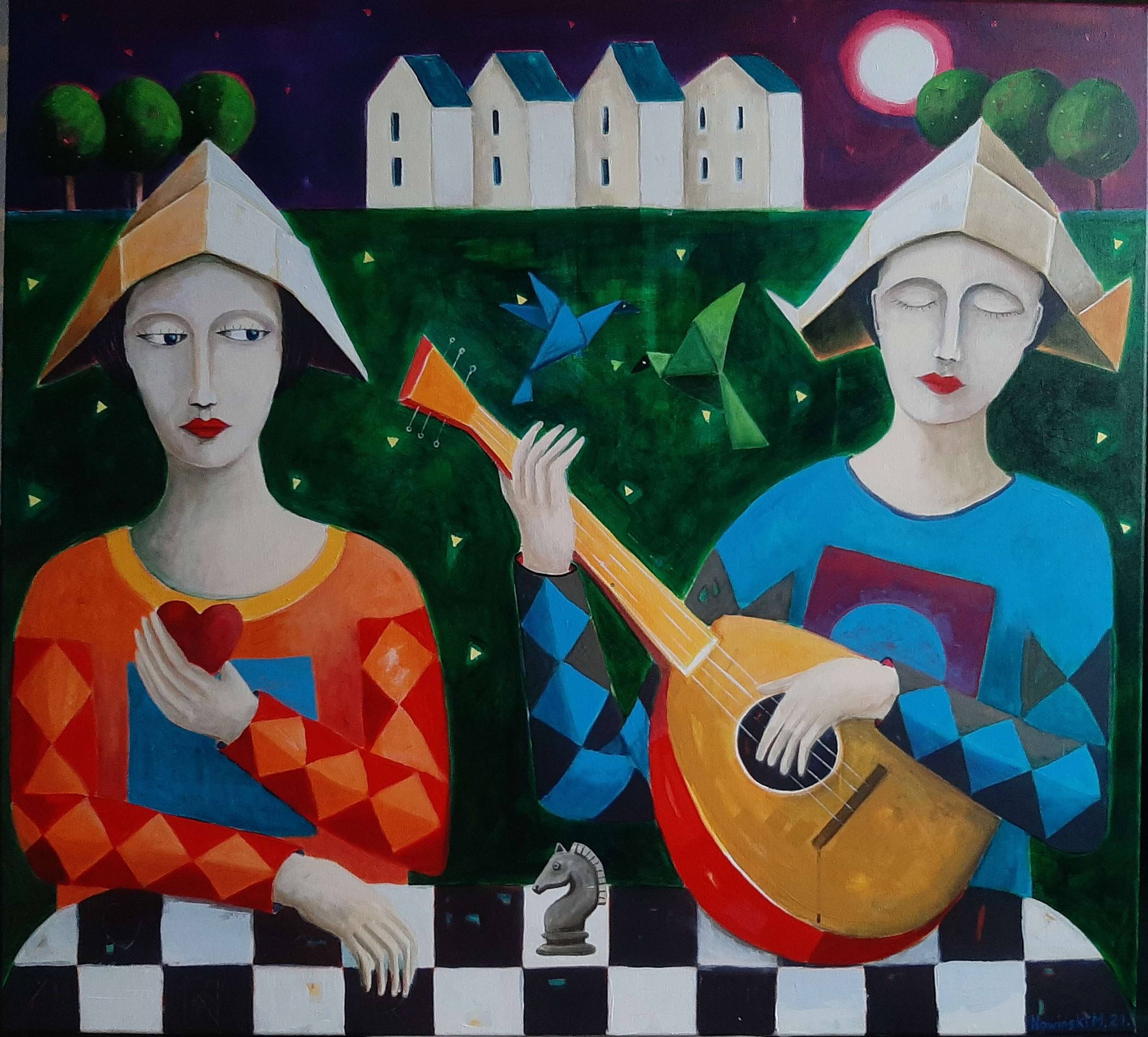 Obraz jest pełen kolorów i geometrii. Dwie postacie z papierowymi kapeluszami przyciągają wzrok. Jedna trzyma serce, a druga gra na lutni. Obie mają na sobie ubrania w intensywnych barwach – czerwienie, pomarańcze i błękity takie jak kalejdoskop. Tło jest tajemniczo zielone z trzema białymi domkami i różowym księżycem wiszącym na niebie. Trzy zielone drzewa dodają harmonii. Na stole widoczna jest szachownica oraz koń – szachowy? Nastrój obrazu jest spokojny, ale jakby coś wisi w powietrzu, może tajemnica albo nostalgia. Artystyczny styl jest inspirowany surrealizmem z elementami kubizmu, co tworzy dreamlike wrażenie. Emocje? Na pewno zaintrygowanie i troszkę niepewności. Ciekawe co one mówią do siebie w tej ciszy. Obraz może wywołać refleksję nad emocjami i wzajemnym zrozumieniem. Dla mnie, jest w tym coś magicznego – taki moment zatrzymany w czasie. Może właśnie dlatego dzieci widzą w tym coś z bajek. Postacie na obrazie zdają się mówić więcej gestami niż słowami. Ale kto wie, może to tylko moja wyobraźnia płata figle.