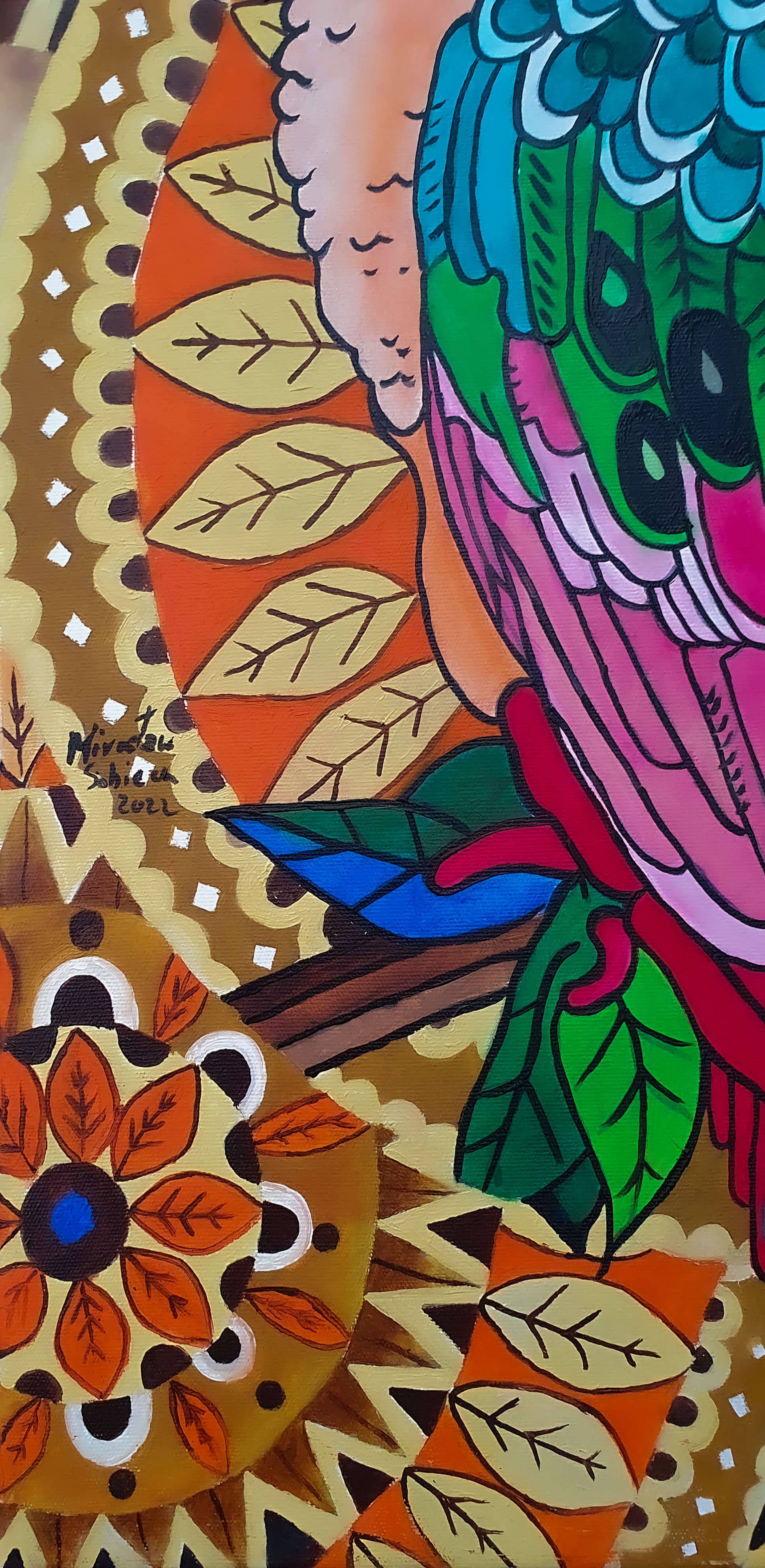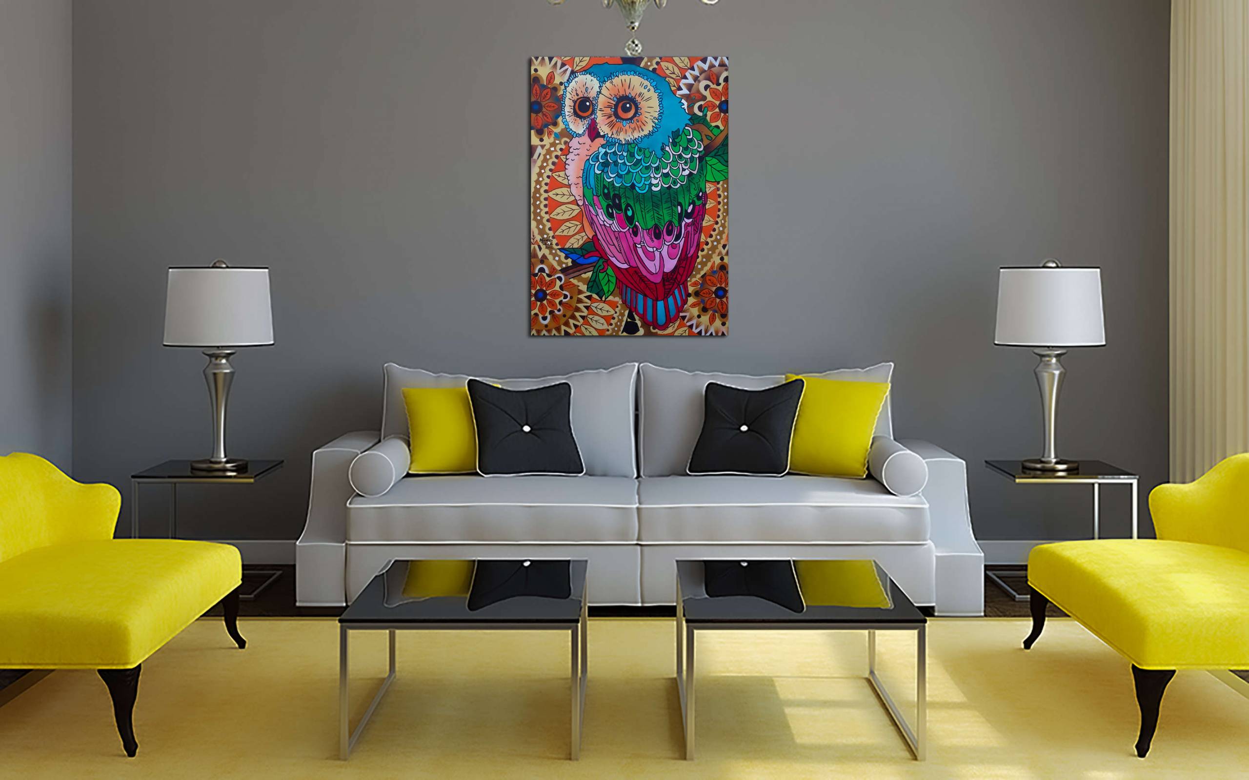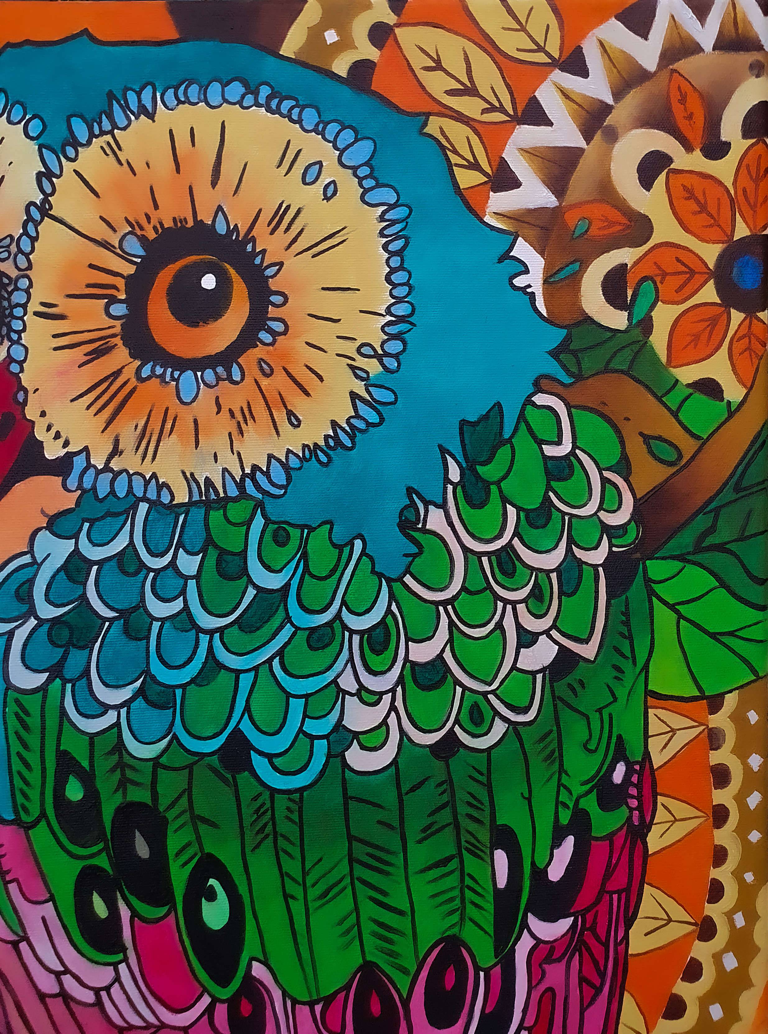 Fantazyjna Sowa z krainy CHILLOUTU rozmiar 70x50. Obraz ma zamalowane boki na czarno. Pokryty warstwą werniksu. Wysyłam starannie zapakowany. Gorąco Polecam