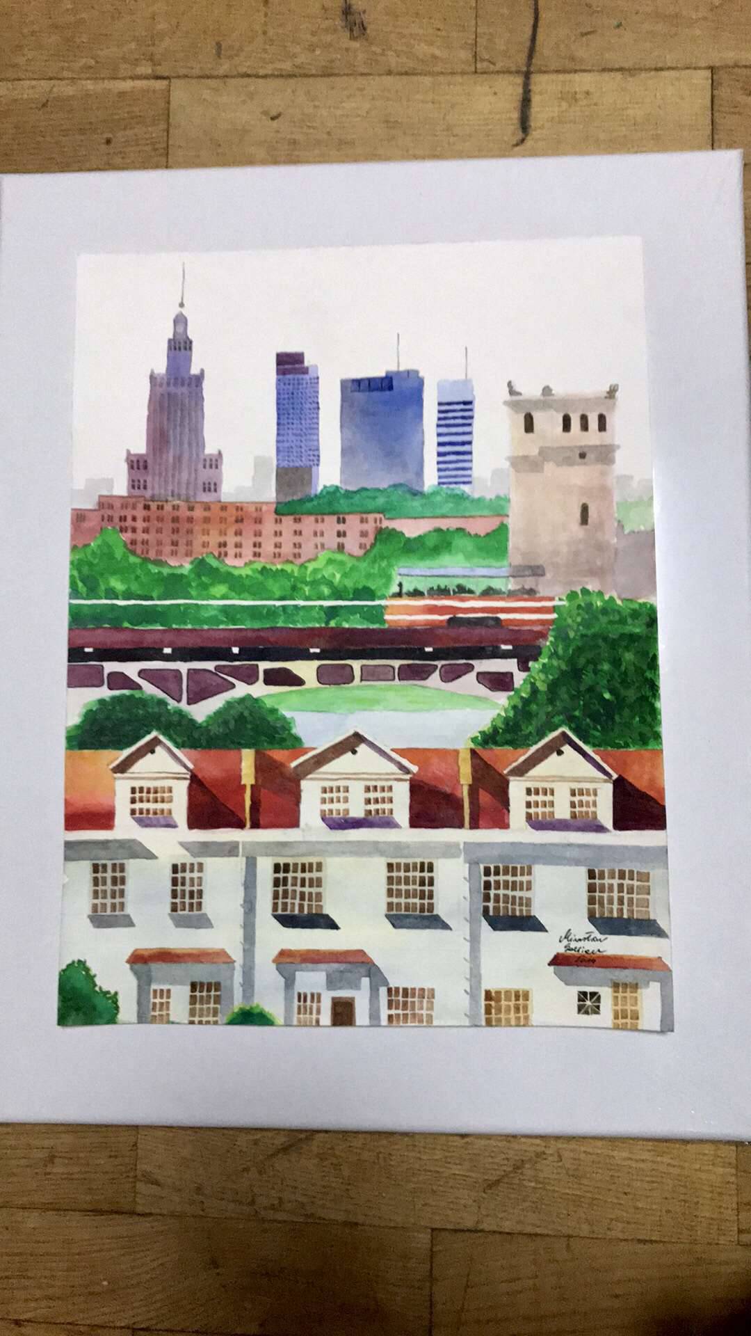 Warszawski pejzaż w wersji akwarelowej Żywe kolory pasują do każdego wnętrza biura, kawiarni, mieszkania itp.