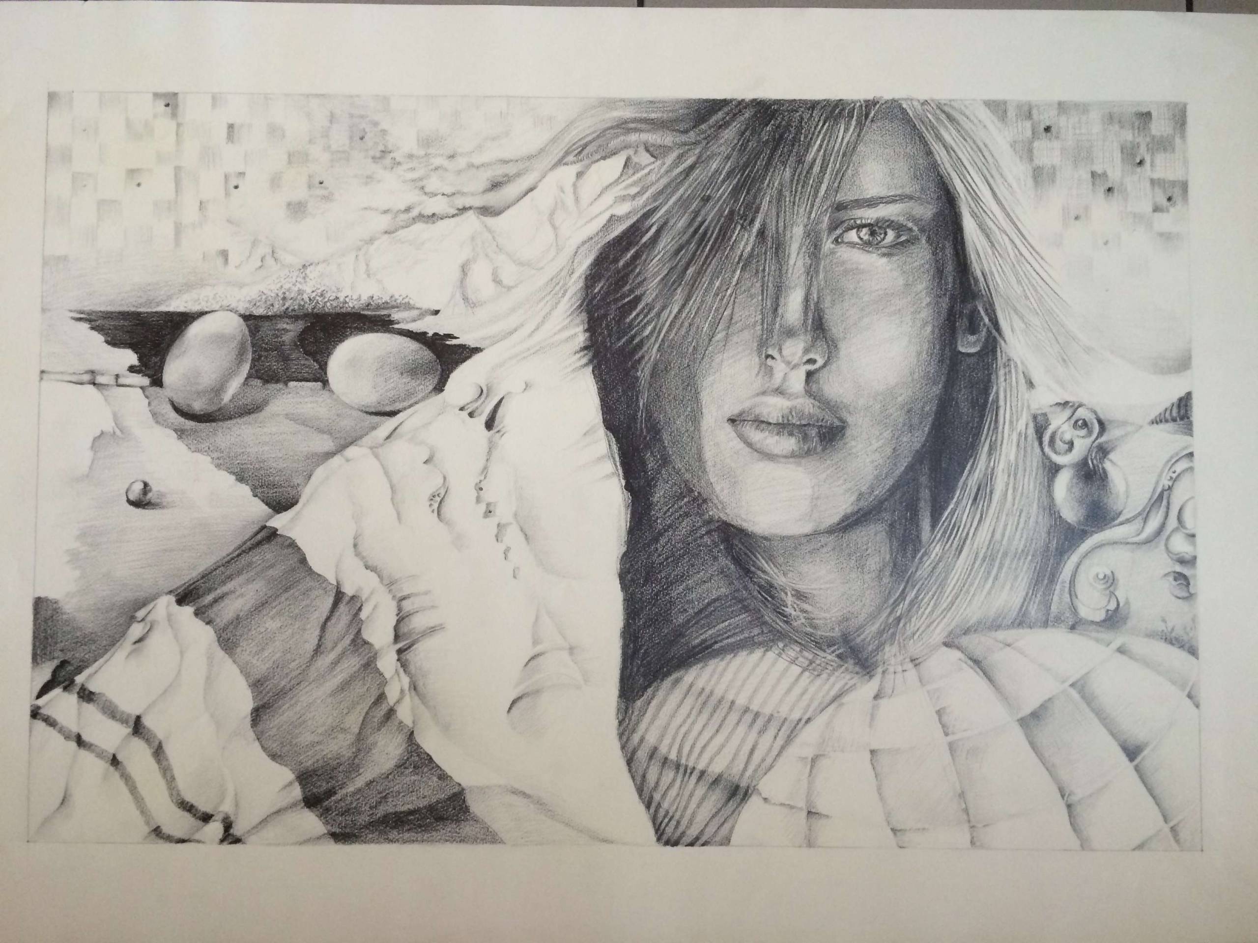 Na obrazie widzimy intrygujące połączenie portretu kobiety z surrealistycznym pejzażem. Dominuje tu skala szarości—od intensywnie zacienionych miejsc po delikatne, niemalże niewidoczne linie, które przypominają mgłę otulającą tajemniczą postać. Jej oczy, głęboko osadzone, zdają się przenikać naszą duszę. Kształt twarzy tworzy harmonijną całość z resztą płótna, układając się w echa górskich krajobrazów i dziwacznych form przypominających rzeźby. Atmosfera jest pełna nostalgii i tajemnicy, jakby artysta chciał nas zabrać w podróż do innego wymiaru. Technika użyta w tym dziele to chyba ołówek, z mistrzowskim cieniowaniem, które nadaje głębi i realności. Całość kompozycji jest bardzo dreamlike, jakby wyciągnięta prosto z naszej wyobraźni. Ja bym tu z pewnością przysiadła na chwilę. To dzieło może wywoływać różne emocje. Dla jednego będzie to cisza, spokój i refleksja. Dla innego—niepokój, bo dlaczego tam są jajka? Cała scena jest jak z nieziemskiego snu, a twarz kobiety jest intrygująca, trochę jak marzenie, które trudno zapomnieć. Siedmioletnie dziecko może powiedzieć: "Ta pani wygląda jak z bajki!". To artystyczne "wow" łączy w sobie wiele stylów, wciągając nas w swoje nieoczywiste historie.