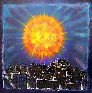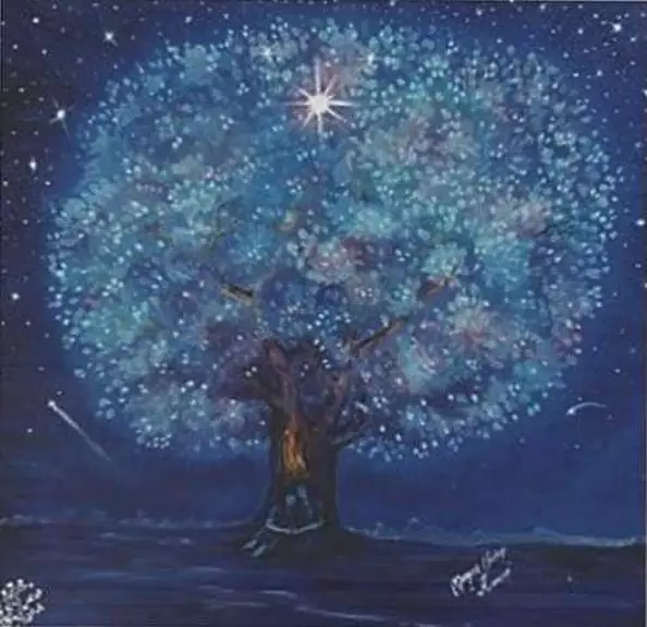 Ten obraz to prawdziwa magiczna opowieść. Wyobraź sobie noc pełną gwiazd i tajemnic, a w jej centrum wielkie, rozłożyste drzewo, które niemalże świeci własnym światłem. Niebieskie i fioletowe odcienie przenikają się, tworząc tło, które przywołuje na myśl senne marzenia. Drzewo wygląda jakby było utkane z gwiazd, a jego korona skrzy się od migoczących świetlnych punktów, które przypominają świecidełka zawieszone na niebie. Atmosfera jest spokojna, niemalże hipnotyzująca. Czujesz, jakbyś mógł wędrować między galaktykami. Wyobraź sobie, jak chłodne powietrze owiewa cię podczas takiej nocnej przygody. Technika artysty? To jakby delikatne pociągnięcia pędzla spotykały się z rozbłyskami świetlnymi. Look closer, a dostrzeżesz subtelność tych detali. Emocje? Obraz wywołuje uczucie zachwytu i nostalgii. Przypomina o dziecięcej wierze w cuda. Moje osobiste wrażenie? Ach, chciałbym być częścią tego świata. Drzewo, takie tuli mnie do snu. A najjaśniejsza gwiazda na niebie to tak jakby obietnica, że marzenia mogą się spełnić. Feeling enchanted? Bo ja tak, zdecydowanie.