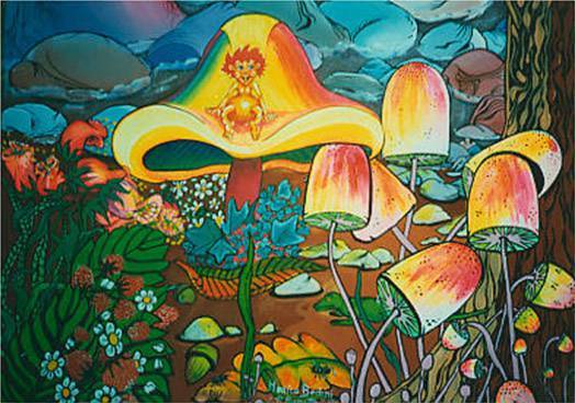 Ten obraz to prawdziwa eksplozja kolorów. Dominują soczyste zielenie, ciepłe pomarańcze i intensywne żółcie, które tworzą magiczny, niemal baśniowy świat. Na pierwszym planie widnieją duże, surrealistyczne grzyby o kapeluszach przypominających gigantyczne parasole. Ich kształty są miękkie i faliste, nadające całości lekkości i dynamiki. Tło obrazu tonie w odcieniach błękitu, co nadaje mu nieco tajemniczą atmosferę. Obraz emanuje radosną, ale jednocześnie nostalgiczną atmosferą, jakby przenosił nas do krainy snów. Styl jest wyrazisty, pełen szczegółów, charakterystyczny dla surrealistycznej techniki, gdzie rzeczywistość miesza się z fantazją. Artysta używa rozmytych konturów i intensywnych barw, aby tworzyć żywe kontrasty i podkreślić swój bajkowy przekaz. Odbiorca może poczuć się jak dziecko czytające magiczną opowieść przed snem. To miejsce, gdzie wyobraźnia nie ma granic, gdzie można spotkać uśmiechniętą wróżkę skrytą pod jednym z wielkich kapeluszy. Całość jest enchanting (uratowałem się angielskim słowem!), czymś, co przyciąga wzrok i prowokuje do marzeń. Patrząc na to dzieło, można z łatwością wyobrazić sobie, jak opowiada dzieciom historię pełną przygód i tajemnic. Fajnie byłoby tam być! Może to obraz o niewinności, może o ucieczce w świat wyobraźni. Ale wiesz co? To, co najważniejsze, to jak dzieło wpływa na ciebie. Pełne barwne opowieści, które rozciągają się na płótnie, wywołują uśmiech na twarzy, pozostawiając po sobie poczucie lekkości i beztroski.