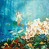 Obraz przedstawia magiczną scenę podwodnego świata pełnego kolorów i życia. Dominują błękity, turkusy i głębokie zielenie, które płynnie przechodzą w jasne pastelowe odcienie koralowców. W centrum znajduje się syrena o kasztanowych włosach i złocistej ogonie, lekko unosząca się w wodzie. Jej postać jest delikatna i eteryczna, co dodaje obrazowi baśniowego charakteru. Wokół niej różnorodne ryby wirują w magicznym tańcu, przypominając, że ocean kryje tajemnice. Kompozycja obrazu jest dynamiczna, wypełniona ruchem i harmonią przyrody. Atmosfera obrazu jest spokojna, lecz pełna tajemnicy i odkryć. Widz może poczuć się zaintrygowany, niemal jakby sam zanurzał się w świecie pełnym barw i dźwięków. Styl jest lekki, z delikatnie nakładającymi się akwarelowymi plamami, co nadaje kompozycji subtelny efekt dreamlike. Wiatr w jej włosach wygląda jak prawdziwe włosy mojej lalki, mówi dziecko. Obraz może wzbudzać poczucie wolności i dziecięcej ciekawości. Może przywoływać wspomnienia z wakacji nad morzem, tęsknotę za beztroskimi dniami. To dzieło budzi refleksje na temat piękna natury. Kolory są uplifting, a całość przyciąga wzrok i prowokuje do zatrzymania się choćby na chwilę.