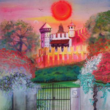 Obraz urzeka kolorami. Intensywna czerwień i róż przechodzą w subtelne odcienie zieleni. Na horyzoncie króluje zamek, który wygląda jak z bajki. Wieże są strzeliste, zwieńczone charakterystycznymi dachami. Kompozycja jest harmonijna, zamek otoczony drzewami tworzy centralny punkt obrazu. Atmosfera jest magiczna, prawie jak ze snu. Czuć w powietrzu tajemnicę, która przyciąga wzrok. Technika użyta przez artystę przypomina akwarele, choć barwy są dużo intensywniejsze. Może właśnie przez te kolory obraz przebudza takie emocje. Niby bajka, ale jednak coś więcej. Obraz wywołuje w odbiorcy uczucie nostalgii i tęsknoty za dzieciństwem. Może każdemu przypomnieć chwile, gdy marzyło się o zamkach i rycerzach. Styl artystyczny jest zwięzły, ale niesie w sobie wiele szczegółów, które można odkrywać powoli. That feeling you get, kiedy patrzysz na coś, co wydaje się jednocześnie znajome i nieznane, sprawia, że chce się go oglądać bez końca. Mogłoby powiedzieć dziecko: "A ja chciałbym tam mieszkać!". Zamek zdaje się być żywy, emanuje ciepłem i spokojem. To jak podróż do miejsca, gdzie wszystko jest możliwe. Patrząc na obraz, łatwo dać się ponieść marzeniom i fantazji. Nawet te drobne szczegóły, jak ptaki na niebie i zachodzące słońce, dodają całości niezwykłego uroku.