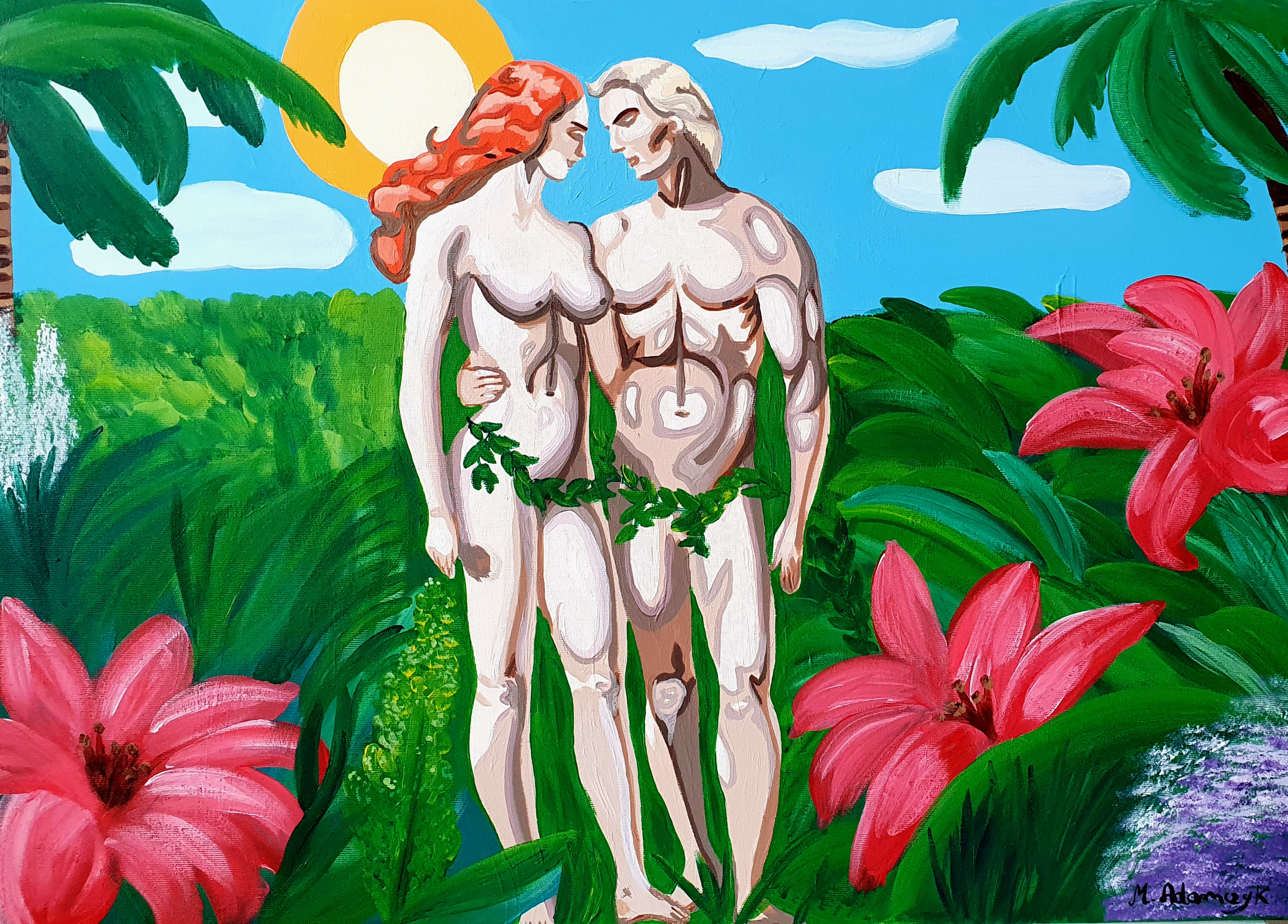 Obraz emanuje tętniącą życiem paletą barw. Na pierwszym planie widzimy Adama i Ewę, otoczonych bujną roślinnością. Ich cielesność podkreślona jest przez delikatne pociągnięcia pędzla, nieco abstrakcyjne, które dodają scenie dynamizmu. Wielkie, jasne słońce z tyłu, z błękitnym niebem i paroma chmurkami, tworzy atmosferę spokoju i harmonii. W stylu artystycznym widoczny jest wpływ ekspresjonizmu z jego wyrazistymi kolorami i odważnymi liniami. Artysta bawi się kształtami, co dodaje całości nieco surrealistycznego posmaku. Emocje wzbudzane przez dzieło to mieszanina zadumy nad naturą i ukrytą symboliką obecności człowieka w niej. Może to być interpretowane jako refleksja nad niewinnością i utraconym rajem. Ten obraz w pewnym sensie jest nostalgiczną podróżą, przypominającą nam o pierwotnej, nierozerwalnej więzi człowieka z naturą.