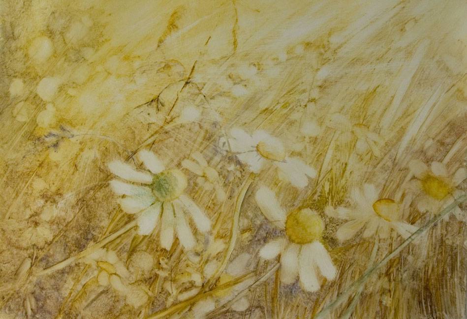 Na tym obrazie dominują delikatne odcienie żółci i bieli, które tworzą sielankową scenę pełną rumianków. Kwiaty zdają się tańczyć w lekkim wietrze, niczym wesołe dzieci na letniej łące. Całość jest zanurzona w ciepłym świetle, które przypomina wczesne poranki albo późne popołudnia, kiedy słońce leniwie muska krajobraz. Artystyczna technika przypomina akwarelowe pociągnięcia, gdzie kształty są rozmyte i subtelne, co nadaje obrazowi pewnej dreamy quality. Patrząc na niego, czuje się spokój i beztroskę. Obraz wywołuje uczucie nostalgii za prostymi przyjemnościami natury, za chwilami, kiedy czas płynął wolniej. Ewidentnie jest to uchwycenie momentu pełnego harmonii. Mam wrażenie, że gdyby dotknąć płótna, poczułoby się zapach świeżo skoszonej trawy i letnich kwiatów. 7-latek mógłby powiedzieć: "To wygląda jak dzień, kiedy się bawiłem na polu z rumiankami!". Jest w tym dziele coś uniwersalnego, co porusza serce. Każde spojrzenie odkrywa coś nowego, jakby obraz miał duszę.