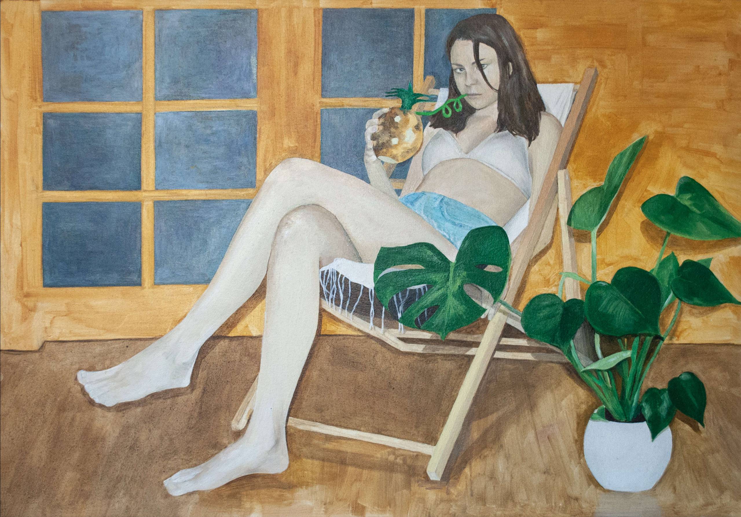 Obraz przedstawia młodą kobietę siedzącą w leżaku przed drewnianą ramą okna wypełnioną błękitnym szkłem, a wszystko to w otoczeniu ciepłych, złocistych ścian. Ubrana w biały top i dżinsowe szorty, trzyma ananasa, co dodaje kompozycji egzotycznego klimatu. Zielone liście monstery w białej donicy wnoszą element naturalny, kontrastując z geometryczną prostotą reszty otoczenia. Atmosfera obrazu jest leniwa i spokojna, jakby odzwierciedlała upalne popołudnie, gdzie czas płynie wolniej. Artysta użył prostych form, ale i subtelnych pociągnięć pędzla, co nadaje całości lekko impresjonistyczny charakter. Kolory są stonowane, ale jednocześnie pełne życia. Możliwe, że za pomocą takiego kontrastu obraz wyraża codzienną tęsknotę za prostotą i przyjemnościami. Kiedy patrzę na to dzieło, czuję się jakbym był na wakacjach. Super! Na pewno wprawia w lekki nastrój marzeń o podróżach. Dla dziecka ten obraz to po prostu dziewczyna z ananasem i wielkim zielonym listkiem! I to jest great. Styl jest nieco nieformalny, bez zbędnego patosu. Przeplatanie takich elementów sprawia, że ten obraz pozostawia widzowi pole do różnych interpretacji i wzbudza prawdziwą ciekawość.