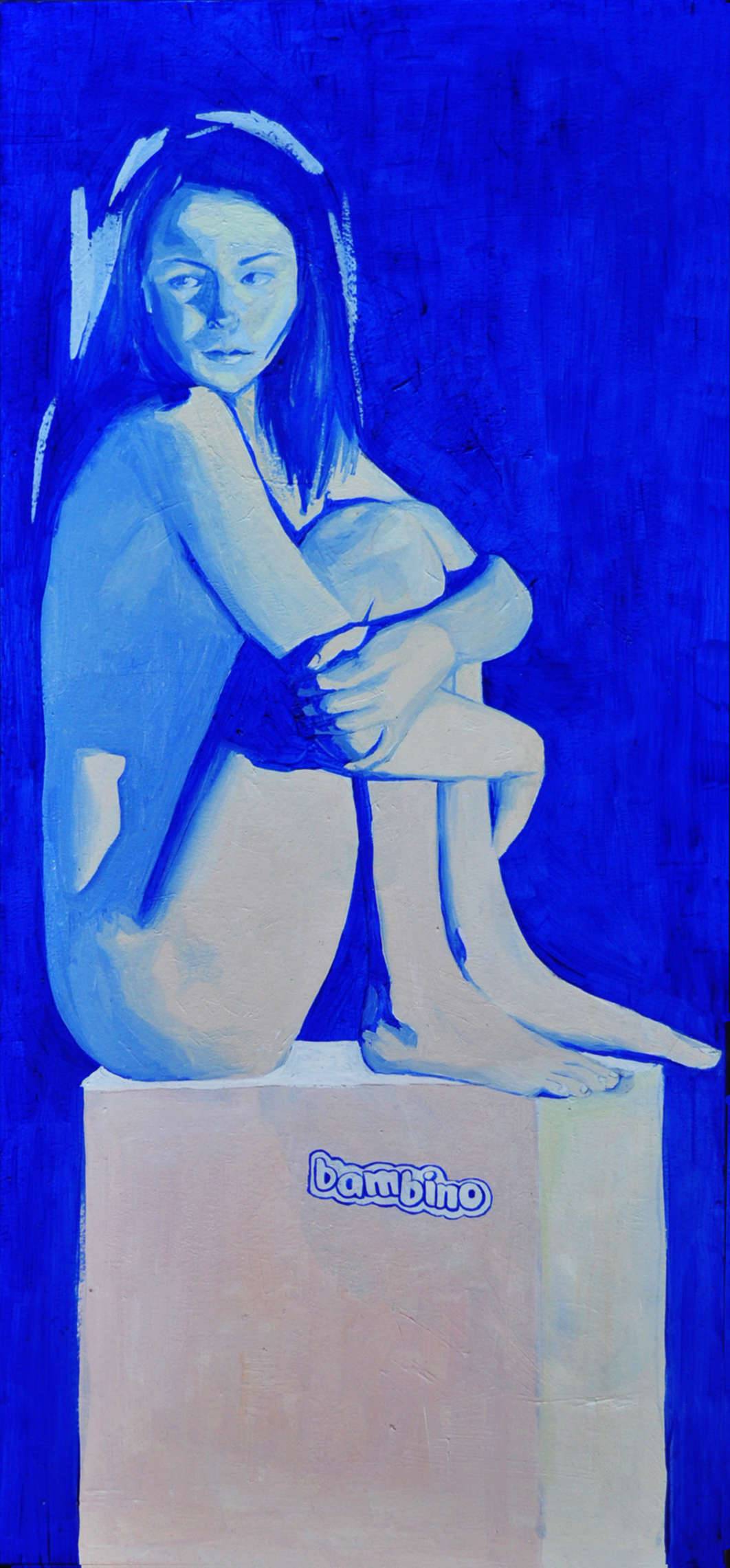 Na obrazie dominuje nasycony, niemal elektryzujący odcień niebieskiego. Postać siedzi na prostokątnym podwyższeniu w pozycji skulonej, a jej sylwetka jest zanurzona w chłodnych tonacjach. Biały kolor subtelnie kontrastuje z niebieskim tłem, tworząc efekt niemal monochromatyczny. Spokojne, choć nieco zamyślone spojrzenie postaci sugeruje klimat introspekcji i refleksji. Artysta zastosował wyraźne linie i płaskie płaszczyzny barwne, co nadaje dziełu styl bardziej graficzny. Technika ta może przypominać nieco pop-art. Kompozycja jest prosta i uporządkowana, lecz zniewalająca w swojej prostocie. Dzieło to emanacja spokoju, ale także zagadki i niepokoju. Dlaczego postać siedzi w takiej pozycji? Może myśli o wczorajszym dniu albo o pysznych lodach. Kolor niebieski, w połączeniu z białym, tworzy "cool" vibe, który może wywoływać w nas uczucie nostalgii. Szczególnie napis "bambino" przykuwa wzrok, przywodząc na myśl dzieciństwo i beztroskę. Obraz ten skłania do zatrzymania się, do podjęcia próby zrozumienia wewnętrznego świata postaci, niczym w ciszy zimowego wieczoru.