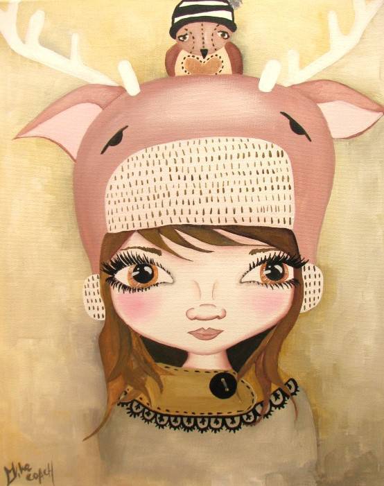 Obraz przedstawia postać z dużymi, wyrazistymi oczami, która nosi uroczy kapelusz przypominający łosia. Dominują delikatne pastelowe kolory — beże, brązy oraz różowe odcienie. Na czubku kapelusza jest mały ptaszek, co dodaje kompozycji nutki humoru i dziecięcej niewinności. Kształty są zaokrąglone, a linie miękkie, co sprawia, że całość wygląda jak scena wyjęta ze snu. Atmosfera obrazu jest ciepła i przyjazna, można poczuć niemal magiczny nastrój. Styl artysty przypomina trochę naiwny realizm, z dużym naciskiem na szczegóły, jak duże, błyszczące oczy, które wydają się patrzeć prosto w duszę. Użycie technik, takich jak subtelne cieniowanie, dodaje obrazu głębi i przestrzeni. To coś, co sprawia, że zatrzymujesz się na chwilę i podziwiasz. "Look at that bird!" powiedziałoby pewnie dziecko stojąc przed tym obrazem. Patrząc na niego, odbiorca może poczuć spokój i nostalgia. Może nawet uśmiech pojawić się na twarzy i wspomnienie nieco odległe, z czasów gdy wszystko było prostsze. Wow, to tak wygląda magiczny świat, prawda?
