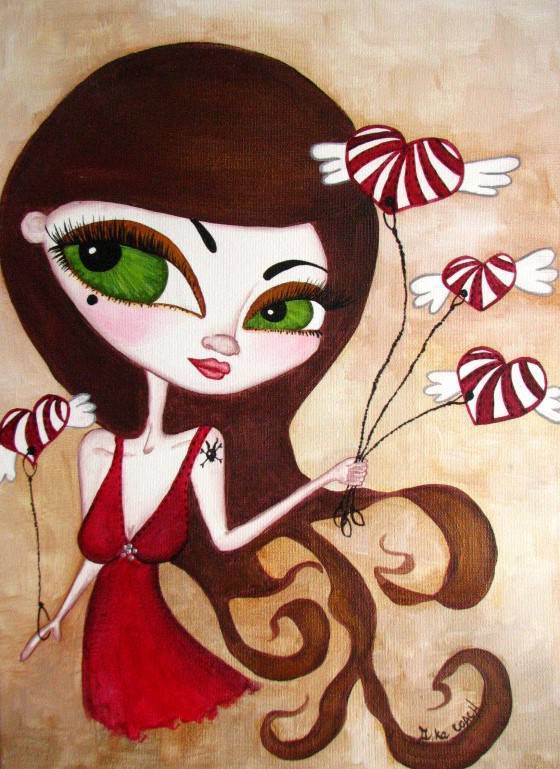 Obraz przedstawia postać kobiety o dużych zielonych oczach, która trzyma w ręku sznurki z balonikami w kształcie serc. Te serca mają skrzydełka, co dodaje im magicznego uroku. Kobieta ma na sobie czerwoną sukienkę, która idealnie komponuje się z jej długimi, brązowymi włosami układającymi się w delikatne spirale. Kolorystyka obrazu jest ciepła, dominują odcienie brązów i czerwieni. Rysunek emanuje tajemniczym, ale i przyjemnym nastrojem. Styl artystyczny jest bajkowy, z nutą surrealizmu. Artysta użył techniki płaskiego barwienia, co nadaje obrazowi komiksowego wyglądu. Emocje, jakie to dzieło może wywołać, to mieszanka nostalgia i pasji. Mój młodszy brat powiedziałby: "O, pani z balonikami!" Obraz jest beautiful w swojej prostocie i symetrii. Patrząc na niego, można się zastanowić, czym są te serca z skrzydłami. Czy symbolizują uczucia, które chcemy puścić wolno, czy może nadzieje, które unoszą nas do góry? Mistyczny klimat wprowadza element refleksji. Atmosfera obrazu sprawia, że zatrzymujesz się na chwilę w codziennym biegu. Jakby artysta chciał powiedzieć: "Zwollnijcie trochę i popatrzcie."