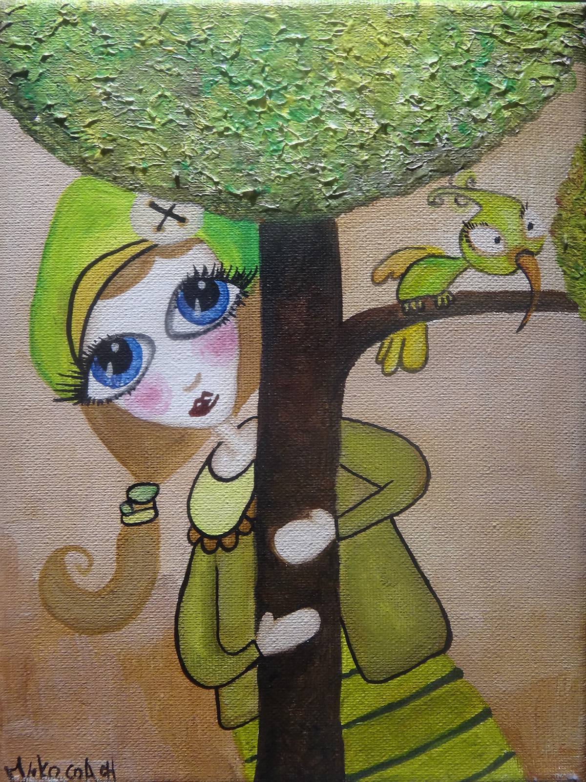 Na tym obrazie dominują ciepłe odcienie zieleni i brązu, które nadają całości przytulny, almost magical klimat. Dziewczynka ukryta za drzewem ma duże, niebieskie oczy, pełne ciekawości i tajemnicy. Drzewo wygląda jakby było zrobione z ciemnej czekolady, a jego liście są fakturalnie gęste, przypominające puchową chmurkę. Obok niej siedzi zielony ptaszek, jakby patrzył wprost na widza i mówił "hej, co tam słychać?". Styl artystyczny jest lekko naiwny, a jednocześnie pełen subtelności. Artysta zastosował grubą warstwę farby na liściach, co dodaje obrazu trójwymiarowości. Całość emanuje prostotą, która może zaskoczyć i rozbawić. Patrząc na obraz, czuć beztroskę dzieciństwa i trochę jakby nostalgia się wpisała w to dzieło. Odbiorcy mogą poczuć się, jakby wracali do czasów, gdy wszystko było proste i prawdziwe. Jakby to było ich secret garden. Można zatrzymać się na dłużej, tylko podziwiając te spokojne chwile. Artysta uchwycił coś z duszy dziecka, coś ulotnego i zarazem trwałego. Dzieciak by powiedział: "Dziewczynka bawi się w chowanego!". I to mówi wszystko, prawda? Cała ta dziecięca aura, niewinność i odkrywanie świata. W tym obrazie tkwi pewna świeżość i radość, które chwytają za serce. Zachwyćmy się tą prostotą!