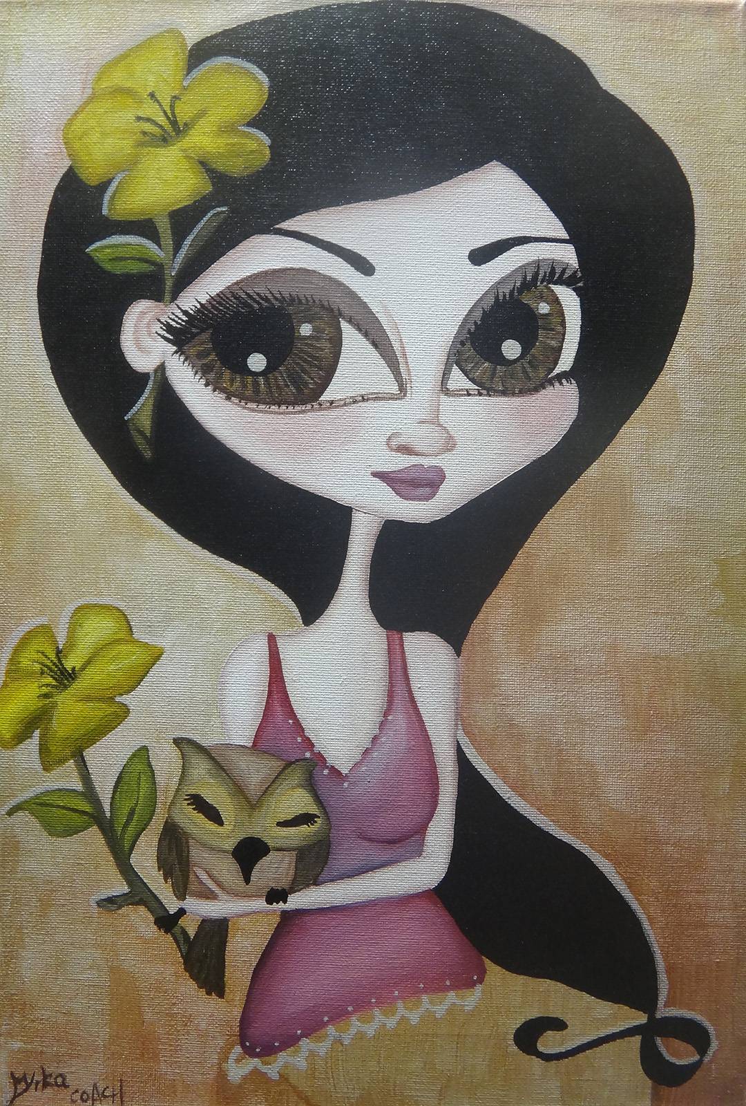 Na obrazie widzimy postać o dużych, wyrazistych oczach, które przyciągają uwagę swoim intensywnym brązem. Otaczająca je czarna kreska dodaje dramatyzmu. Włosy kobiety są gładkie, czarne jak noc, a za uchem wpięty ma duży, żółty kwiat, który pięknie kontrastuje z ciemnymi kosmykami. Jej sukienka ma miły, różowy kolor i tworzy przyjemny kontrast z resztą obrazu. W ramionach postać trzyma sowę, której ciekawe spojrzenie przyciąga wzrok odbiorcy. Kompozycja tego obrazu jest prostolinijna, z naciskiem na twarz i wzrok bohaterki. Styl przypomina nieco surrealizm, z odrobiną cartoonish vibe. Linia jest prosta, kontury wyraziste, a kolorystyka ograniczona, co nadaje dziełu kameralny, nieco tajemniczy nastrój. Artysta zastosował technikę olejną, co widać w miękkości przejść pomiędzy barwami. Obraz emanuje spokojem i subtelną melancholią. Zastanawiam się, co trapi tę tajemniczą postać z sową. Może to tylko ja, ale czuję jakąś nić nostalgii, coś ulotnego, co chwyta za serce. Myślę, jak wyglądałoby życie z tak wielkimi oczami. Troszkę jak w bajce, prawda? Może właśnie taki jest zamysł – byśmy weszli w świat fantazji, gdzie wszystko jest możliwe.