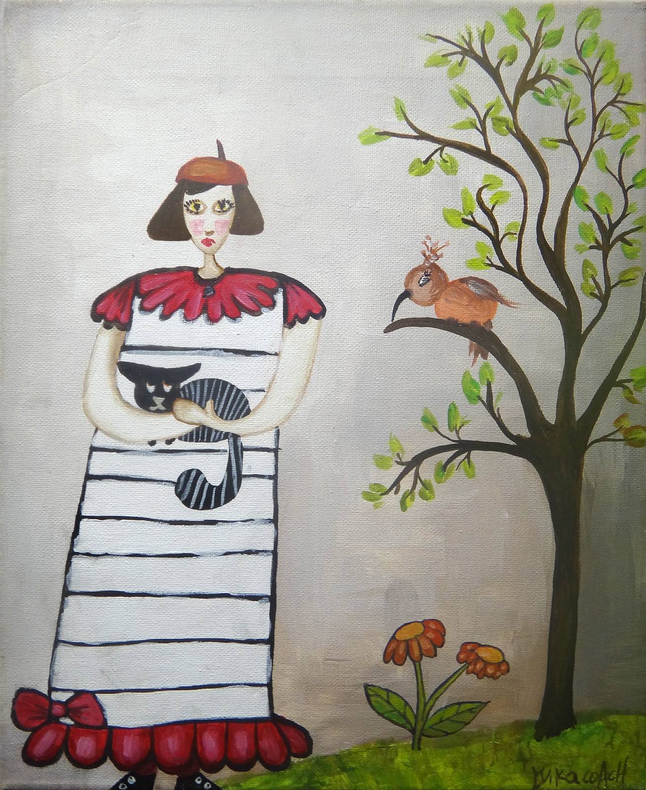 Na obrazie widzimy postać kobiety w pasiastym stroju, trzymającej czarnego kota. U jej stóp wyróżnia się czerwony kwiat, dodający żywy akcent do stonowanej, pastelowej palety kolorów. Obok niej rośnie drzewo z ptakiem siedzącym na gałęzi. Dzieło emanuje spokojem, ale również pewną tajemniczością. Styl artystyczny jest uproszczony, z delikatnymi konturami i wyrazistymi kolorami, co nadaje mu trochę dziecięcego uroku. Artysta zastosował technikę płaskiego koloru i graficznych linii, co daje efekty flattening, jakby obraz był ilustracją z książki dla dzieci. Emocje? Hmm, pojawia się lekki uśmiech, gdy patrzę na tę scenę. Jest coś nostalgicznego w prostocie obrazu. Może to ta niewinność bijąca z postaci i jej towarzyszy. Wydaje się, że kot, siedząc spokojnie, snuje swoją własną opowieść, podczas gdy ptak cichutko obserwuje świat. A to drzewo? Jakby wyjęte z magicznego ogrodu, pełne przygód. Jest w tym elemencie freedom, przestrzeń dla wyobraźni. Obraz potrafi wzbudzić różne interpretacje. Może to spotkanie samotnie spędzanego popołudnia, a może chwila odpoczynku w magicznym świecie fantazji. Każde spojrzenie przynosi coś nowego, coś zaskakującego. A ja, jako dorosły, odkrywam w nim więcej niż na pierwszy rzut oka. "Ten kot wygląda jak mój Smok!", powiedziałoby pewnie 7-letnie dziecko. I w tym jest cała magia.