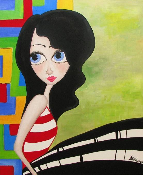 Na obrazie widzimy urocze dziewczę o wielkich, błękitnych oczach, które zdają się śledzić nasz każdy ruch. Jej czarne, falowane włosy kontrastują z jaśniutką cerą, dodając jej postaci magnetycznego uroku. Ubrana w czerwono-białą bluzkę w paski, przyciąga wzrok niczym latarnia morska w ciemną noc. Tło to kolorowy kalejdoskop, pełen żywych czerwień, zieleni, żółcieni i niebieskich kształtów, tworzących dynamiczną, geometryczną mozaikę. Trochę jak puzzle, które układałem z siostrą. Styl przypomina nieco komiksowy, z wyrazistymi liniami i odważnymi plamami barw. Obraz emanuje pewnym tajemniczym, lecz jednocześnie radosnym nastrojem. Można poczuć, że jest to "happy place", gdzie rzeczy stają się mniej poważne, bardziej radosne. Technicznie, artysta użył tutaj płaskich plam kolorów i prostych, ale ekspresyjnych form, tworząc wrażenie lekkości. Dzieło może budzić w odbiorcy nostalgię za dzieciństwem czy marzeniami. Ja patrzę i myślę, że to trochę jak ze snu, ale takiego, który dobrze się pamięta. Patrząc na to, zaczynam mieć wrażenie, że to część jakiejś większej opowieści. Co ciekawe, jeden z elementów tła wydaje się być w stylu retro, dodając całości charakteru. Obraz wciąga i nie chce puścić.