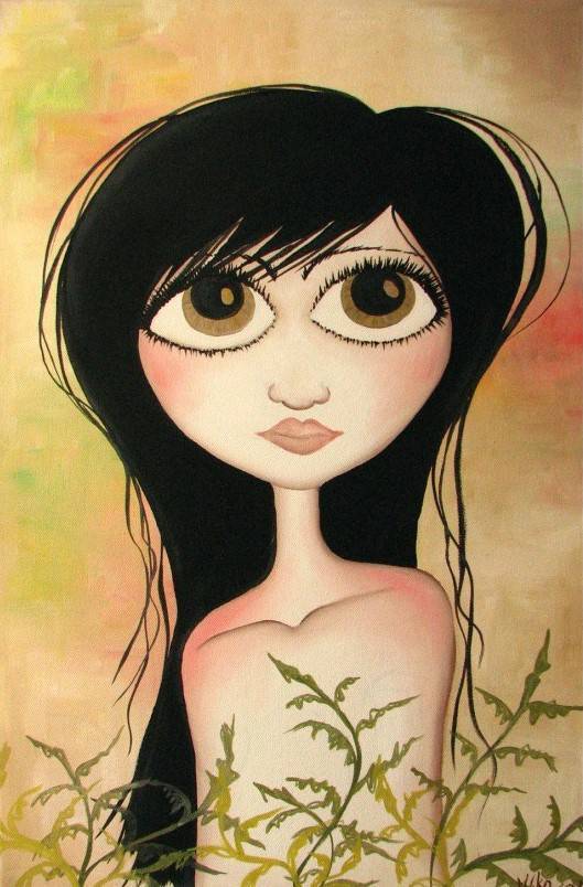 Obraz przedstawia postać o dużych, hipnotyzujących oczach, które zdają się wpatrywać głęboko w duszę widza. Czarna jak węgiel, gładka fryzura kontrastuje z jasnym tłem, które mieni się delikatnymi pastelowymi odcieniami różu i żółci. Kompozycja jest minimalistyczna, co nadaje dziełu szczególną głębię i szczerość. Uwagę przykuwa kontrast między delikatną cerą a intensywnością spojrzenia. Całość emanuje spokojem, ale gdzieś pomiędzy można wyczuć pewien element zagadki. Styl artysty przypomina nieco technikę cartoonową z elementami surrealizmu. Linie są miękkie, a kolory nieco spłaszczone, co nadaje obrazowi specyficzną lekkość, jednak nie odbiera mu powagi. Wzrok widza przyciągają detale - subtelne cienie i czerwone rumieńce na policzkach. Patrząc na ten obraz, można poczuć mieszankę zadumy i nostalgii. Ciekawe, co siedmiolatek by powiedział: "Ona wygląda jak księżniczka z innej planety!". Coś w tym może być. Element dreamlike tego dzieła sprawia, że chce się tam wrócić myślami. Czyż nie przypomina to trochę pierwszego spojrzenia w nieznane? Można by rzec, że obraz ma w sobie coś "mysterious". Fascynujące, jak jedno spojrzenie może urzec aż tak bardzo.