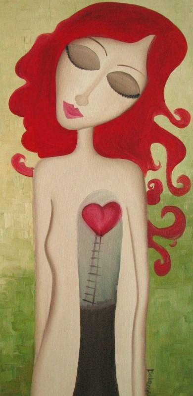 Na obrazie widzimy intrygującą postać z intensywnie czerwonymi włosami, które wiją się jak płomienie na tle delikatnych, zielonkawych odcieni. Wyraziste, zamknięte oczy sugerują spokój i pewną melancholię. A to serce na wierzchu! Coś jakby z bajki, niby siedzi na powierzchni, otoczone tajemniczą drabiną. Tło jest monochromatyczne, prostokątne pociągnięcia pędzla tworzą fakturę przypominającą niebo o zmierzchu. Styl obrazu przywodzi na myśl surrealizm, chociaż jest w nim nuta współczesnej prostoty. Prostota i dziwność idą tu ramię w ramię. Dzieło wywołuje mieszane uczucia. Może smutek, może zadumę, a może taki spokój, jak gdy patrzysz na deszcz za oknem w ciepłym kocu. Czuję jakieś "wewnętrzne" ciepło, które nie do końca potrafię nazwać. Fantastical! Mimo zawiłości obrazu, jest tu coś, co przyciąga wzrok jak magnes i nie pozwala oderwać od tego wzroku. Linia drabiny w sercu – symbolizuje duchową wspinaczkę? Czy to droga do wnętrza samego siebie? Dziecko powiedziałoby: lubię te czerowne włosy! Ten obraz to przestrzeń do refleksji i podróży w głąb własnych myśli.