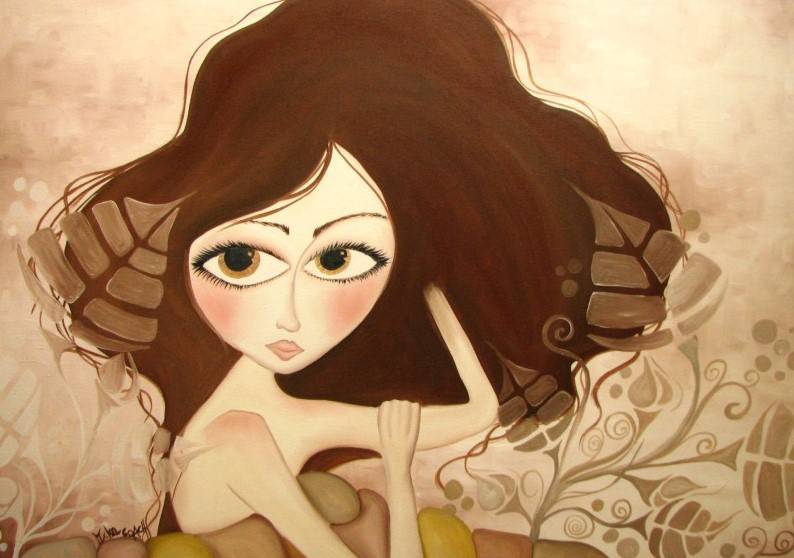 Na obrazie widzimy tajemniczą postać kobiety z wielkimi oczami, które zdają się patrzeć prosto w duszę. Dominują ciepłe odcienie brązu i beżu, nadające całej kompozycji delikatności i subtelności. Fryzura przypomina płynącą rzekę włosów, otoczonych abstrakcyjnymi, lekko spiralnymi kształtami, które dodają całości dynamiki. Wygląda, jakby artystka (artist) użyła techniki mieszania akryli, tworząc gładkie przejścia między kolorami. Obraz emanuje nieco nostalgiczną, ale jednocześnie pełną tajemnicy aurą. Można poczuć lekki powiew ekscentryzmu. Patrząc dłużej, widz może odczuć lekki niepokój, jakby coś znajomego i nieznanego jednocześnie, chciało wyjść na powierzchnię. Styl artystyczny przywołuje na myśl surrealizm z nutą minimalizmu, gdzie proste linie spotykają się z rozmytymi kształtami. Osoba, która zatrzyma się przy tym dziele, może poczuć całą gamę emocji – od zachwytu nad elegancką prostotą, po głęboką refleksję nad złożonością ludzkiej natury. Ta dama wygląda trochę jak księżniczka z bajki, powie 7-latek, zauważając baśniowy charakter kompozycji. I choć słowa mogą nie oddać w pełni uroku tego obrazu, jedno jest pewne: ten obraz zostaje w pamięci.