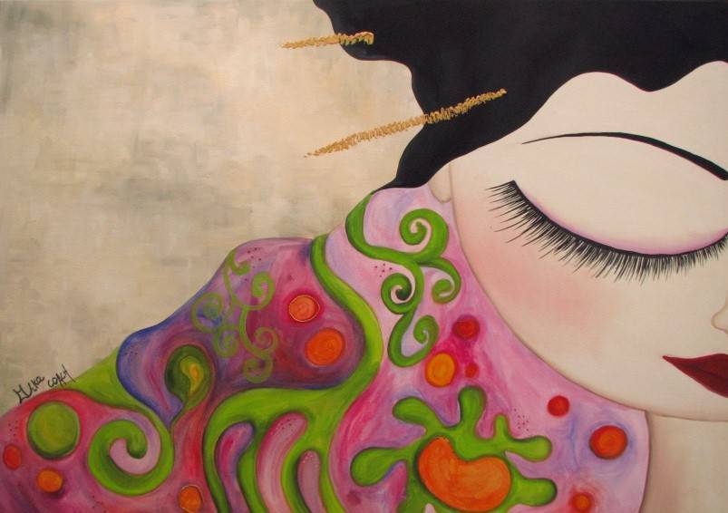 Ten obraz przedstawia urzekający portret kobiety, której delikatnie zamknięte powieki i spokojny wyraz twarzy nadają całości aurę tajemniczości. Dominują tu intensywne kolory: różowy, zielony i pomarańczowy, które zwijają się we wzory przypominające fantastyczne rośliny. Kompozycja skupia się na harmonii barw i eleganckim kształcie głowy, która częściowo wypełnia płaszczyznę obrazu. Atmosfera obrazu jest pełna spokoju, niemal szeptu. Czuć tu dalekowschodni wpływ, który przywodzi na myśl subtelność tradycyjnej sztuki japońskiej. Technika wykorzystana przez artystę zdaje się być połączeniem płynnych ruchów pędzla i dynamicznych kontrastów, co nadaje kompozycji oniryczny nastrój. Obecność złotych elementów w włosach dodaje tej scenie nutki glamouru. Dzieło to może wydobywać z widza emocje jak spokój oraz refleksję. Jest w nim coś nostalgicznego, co skłania do chwilowego zatrzymania się i zanurzenia w chwili „tu i teraz”. Angielski akcent w tym opisie? Total harmony. Oczarowuje prostotą i głębią, pozostawiając odbiorcę z chęcią ponownego zanurkowania w tym śnie. To obraz, który mówi mniej przez słowa, a więcej przez subtelność. „Ma piękne kolorki!”, powiedziałoby dziecko. Jest coś w tym obrazie, co przypomina o pięknie tkwiącym w szczegółach.