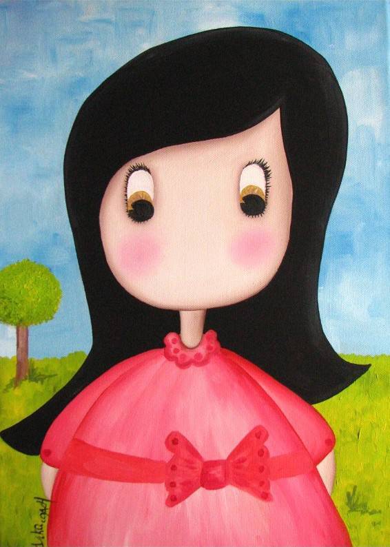 Na obrazie widzimy uroczą, kreskówkową dziewczynkę o dużych, lśniących oczach i delikatnym uśmiechu. Jej bujna, czarna czupryna kontrastuje z delikatnym różem na policzkach, nadając twarzy niesamowitą wyrazistość. Sukienka w odcieniu żywej czerwieni z kokardką dodaje jej figlarności i dziecięcej energii. Całość tła to idylliczny pejzaż. Subtelny błękit nieba miesza się z żywą zielenią trawy i radosnym plamami drzew. Atmosfera obrazu jest wyjątkowo lekka i beztroska. To jak chwila letniego popołudnia zatrzymana w kadrze, pełna nadziei i dziecięcej prostoty. Jakby świat na chwilę się zatrzymał, żebyśmy mogli zanurzyć się w tej sielance. Technika artystyczna może przypominać trochę cartoons' style. Grube kontury i płaskie kolory podkreślają dziecięcy charakter malowidła, a delikatna gra światła na policzkach dziewczynki dodaje jej głębi. Jest coś autentycznie ciepłego w sposobie, w jaki artysta uchwycił te momenty. Kiedy patrzę na obraz, czuję przypływ nostalgii. Przypomina mi to dni beztroskich zabaw i niewinnych marzeń. Moje serce ciepło wypełnia się wspomnieniami, a myśli uciekają w stronę radosnych chwil z dzieciństwa. Ciekawe, jaka przygoda czeka tę dziewczynkę dalej? Moja siostra mówi, że ona wygląda jak lalka, a ja się z tym zgadzam. Te proste linie i żywe kolory wywołują uśmiech na twarzy każdego, kto spojrzy na ten obraz. To mała podróż w czasie, do miejsc, gdzie wszystko wydaje się możliwe i piękne. Such a delight to look at!