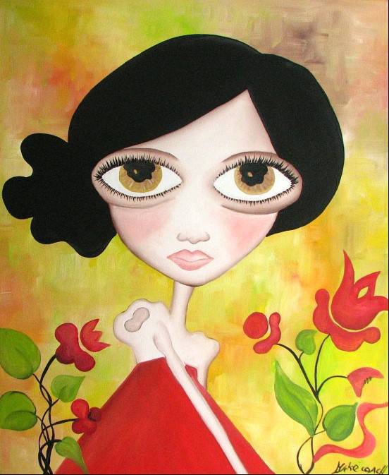 Obraz przedstawia postać o dużych, wyrazistych oczach, które przyciągają spojrzenie od pierwszej chwili. Jej czarne włosy kontrastują z jasnym tłem, które przypomina wiosenny ogród – pełen ciepłych odcieni żółci i zieleni. Czerwone kwiaty dopełniają kompozycji i dodają jej dynamiki. Całość jest tak kolorowa, że aż chce się uśmiechnąć. To tak, jakby postać była uosobieniem delikatności i dziecięcej ciekawości świata wokół. Artystycznie obraz nawiązuje do współczesnego surrealizmu. Linie są delikatne, a kreska – pewna. Duże oczy przypominają styl eye-catching znany z innych dzieł tego typu. Techniką, którą można dostrzec, jest skłonność do upraszczania form i kształtów, przez co obraz staje się niemal bajkowy. Jest w tym coś dziecinnego, jakby ołówkiem narysowane przez 7-latkę. Dzieło emanuje spokojem, ale równocześnie wywołuje dziwne uczucie nostalgii. Ktoś mógłby nawet powiedzieć, że czujemy tu "whimsy". Moja pierwsza reakcja? Poczułem się szczęśliwszy, patrząc na te kolory i wyraz twarzy. Może to coś, czego wszyscy potrzebujemy – chwila oderwania od rzeczywistości w tym zgiełku codzienności.